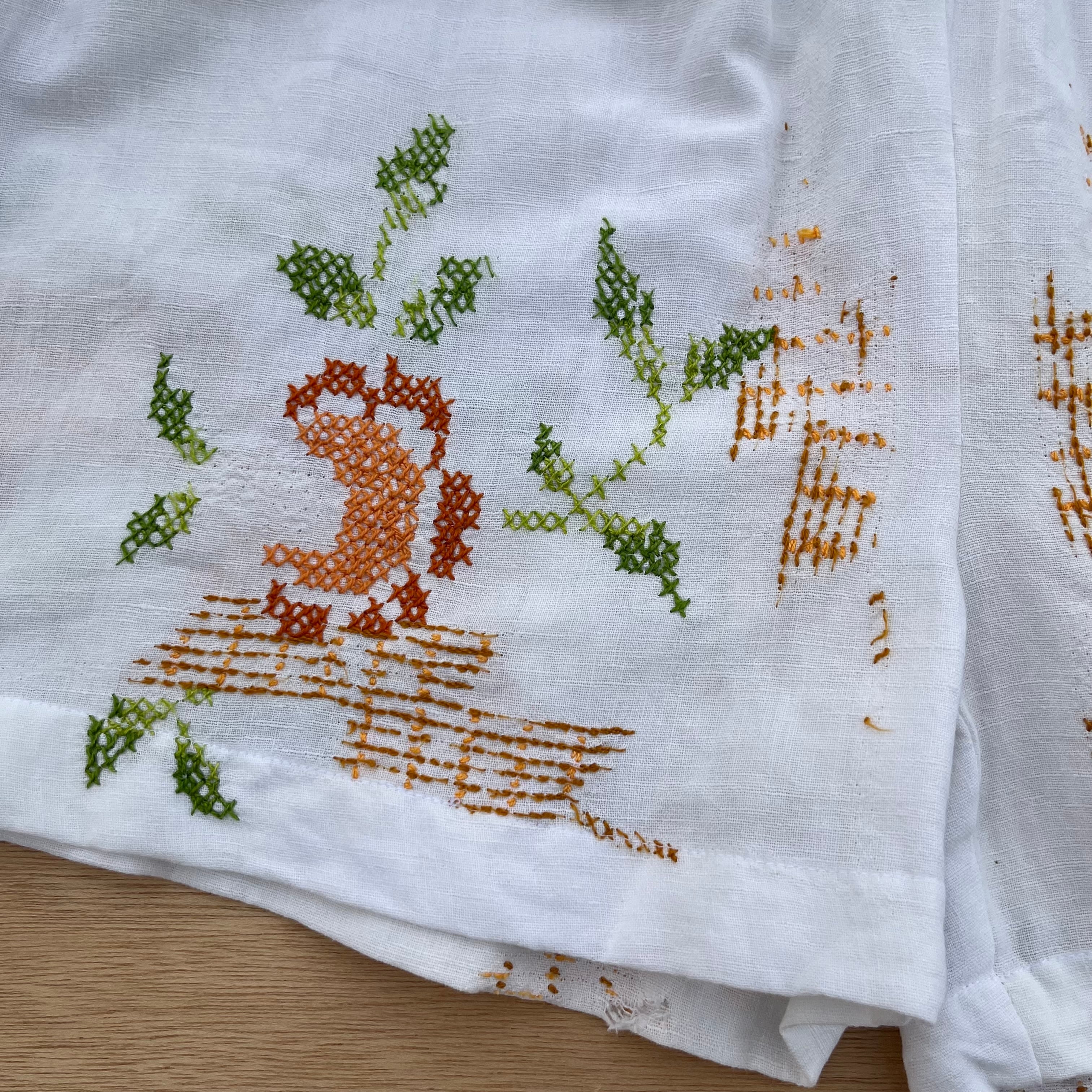 こちらはUSEDアイテムを使用したリメイク商品となります。刺繍クロスの生地は古着のため、刺繍が解けている箇所がございます。ご理解ある方のご購入をよろしくお願いいたします。