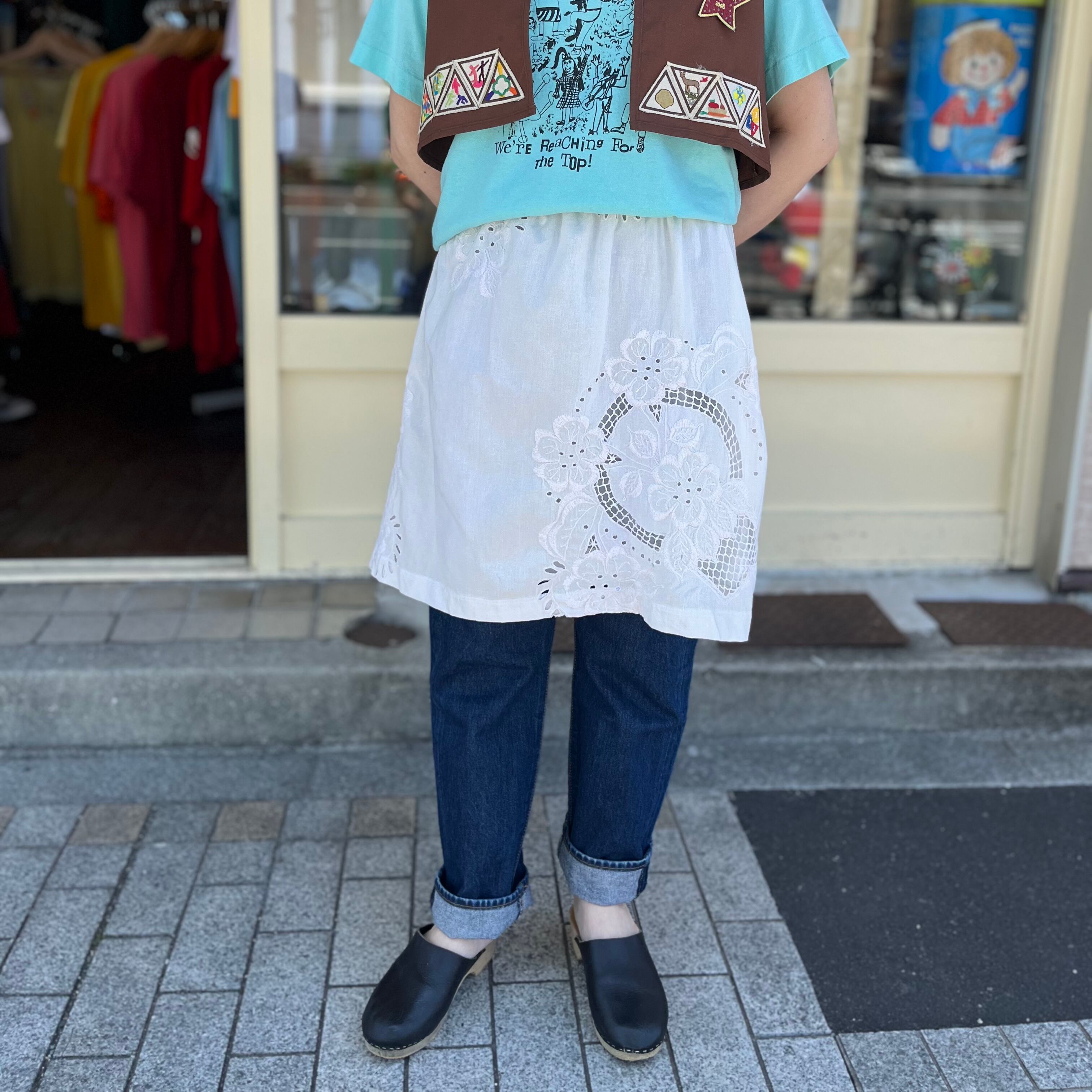 usedのレース生地を使用したリメイクスカートです。エプロンをつけてるようなカントリー感も可愛らしいですね!ロングスカートやボトムスに重ねたりと通年通してアレンジ可能です!