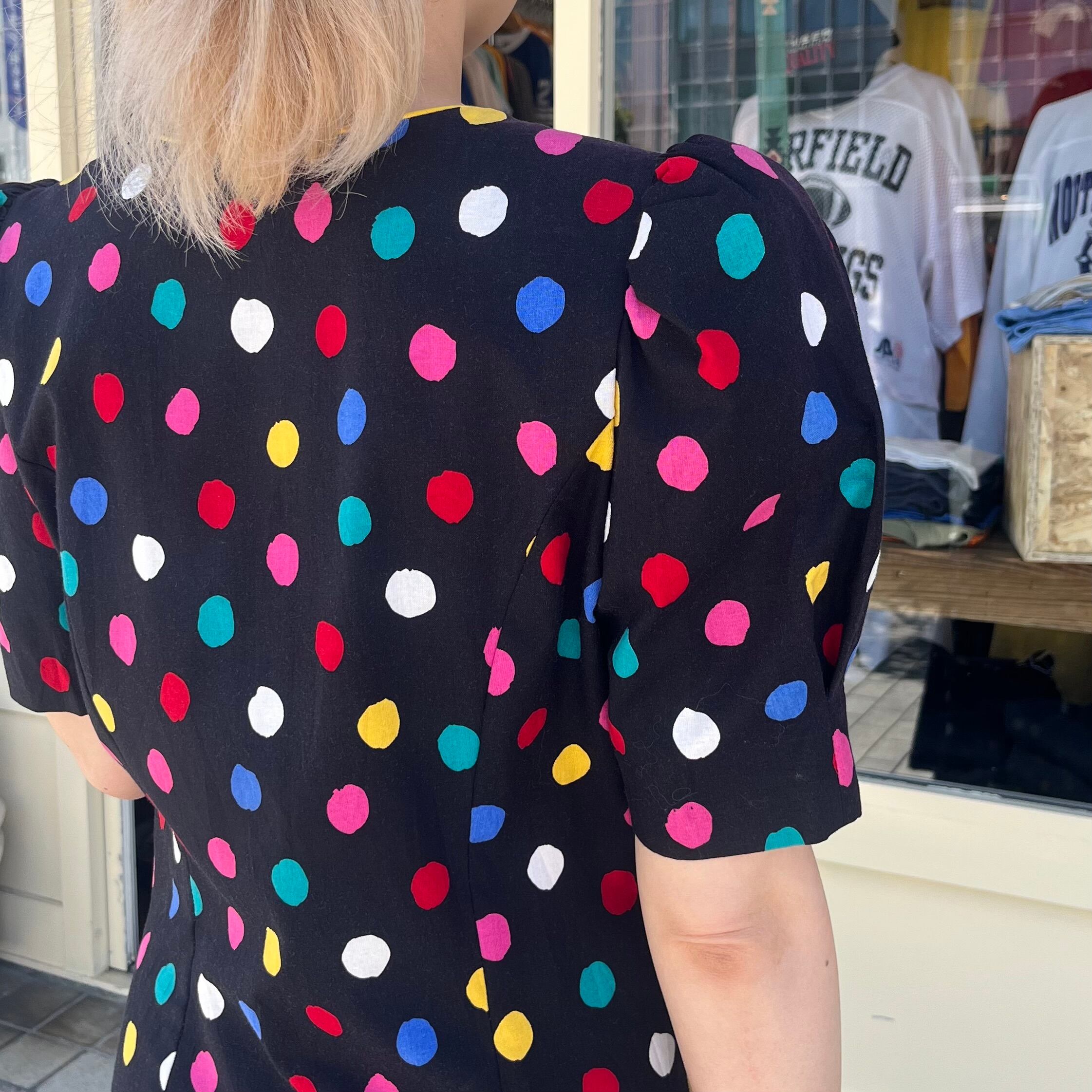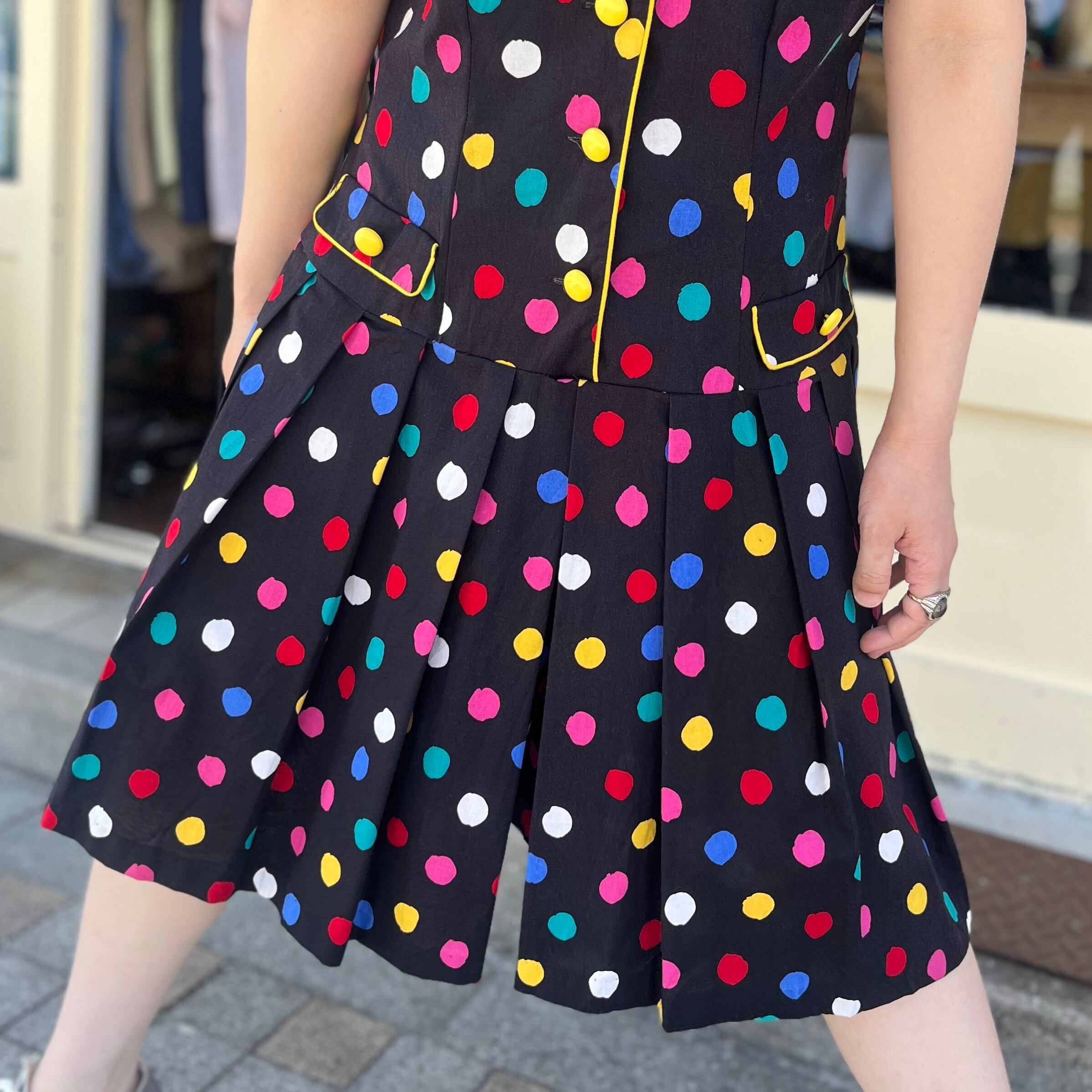 カラフルなドットが80年代らしいポップなワンピースです。トップスとボトムスが一体型になったロンパースタイプでスカートに見える、ハーフパンツ型です。ハーフパンツはプリーツがあり、広がりもあるので着用しやすいですよ!