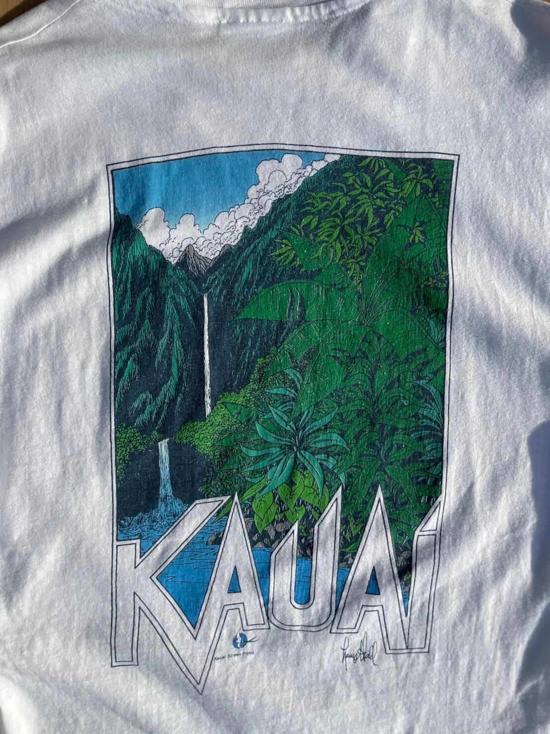 爽やかなバックプリントが映える90年代頃のTシャツです。ハワイ諸島のカウアイ島のロゴや自然のイラストがかっこいいですね。正面にポケットが付いているのもポイントになります!ショーツと合わせたり、アウドドアファッションなスタイルに取り入れたくなる一枚です。