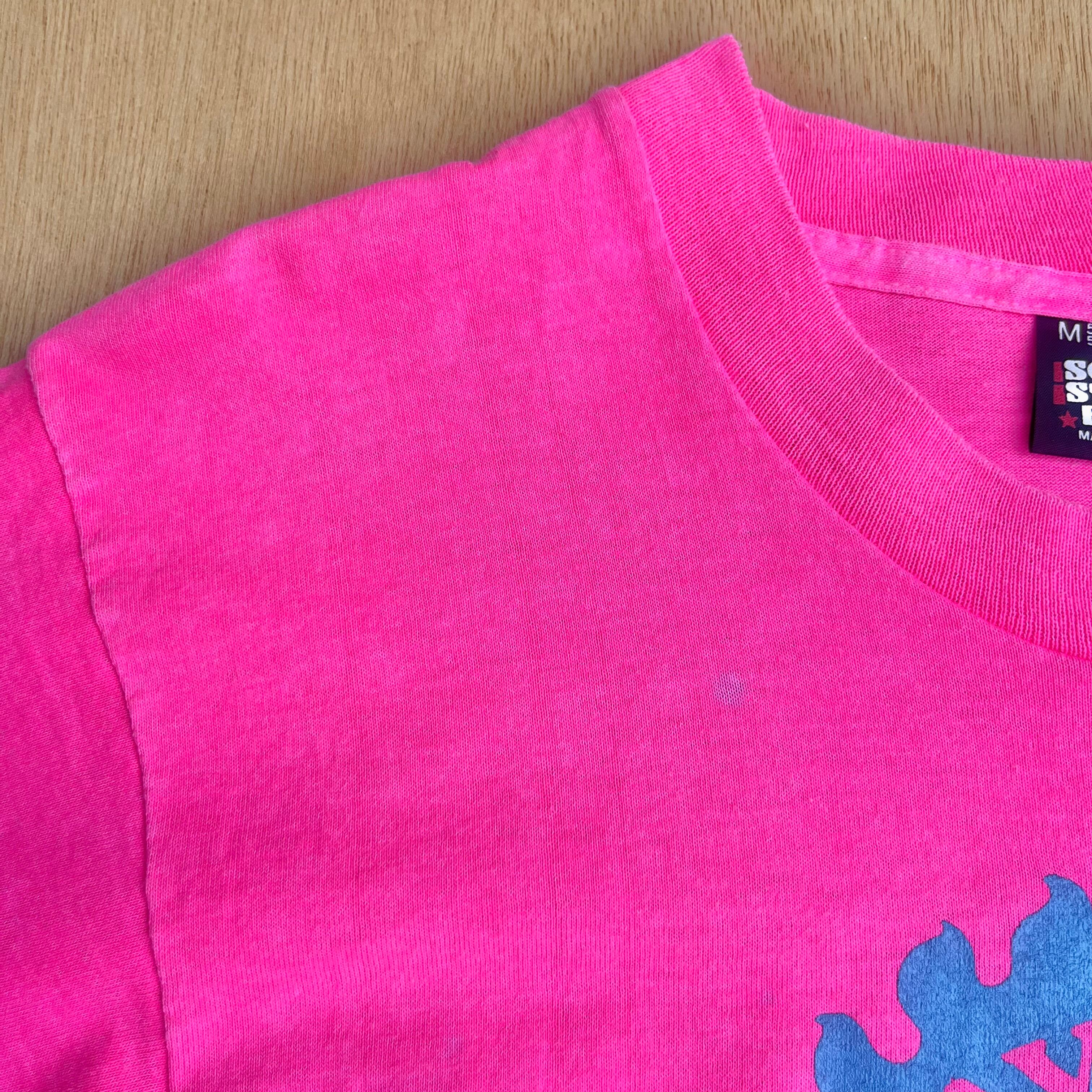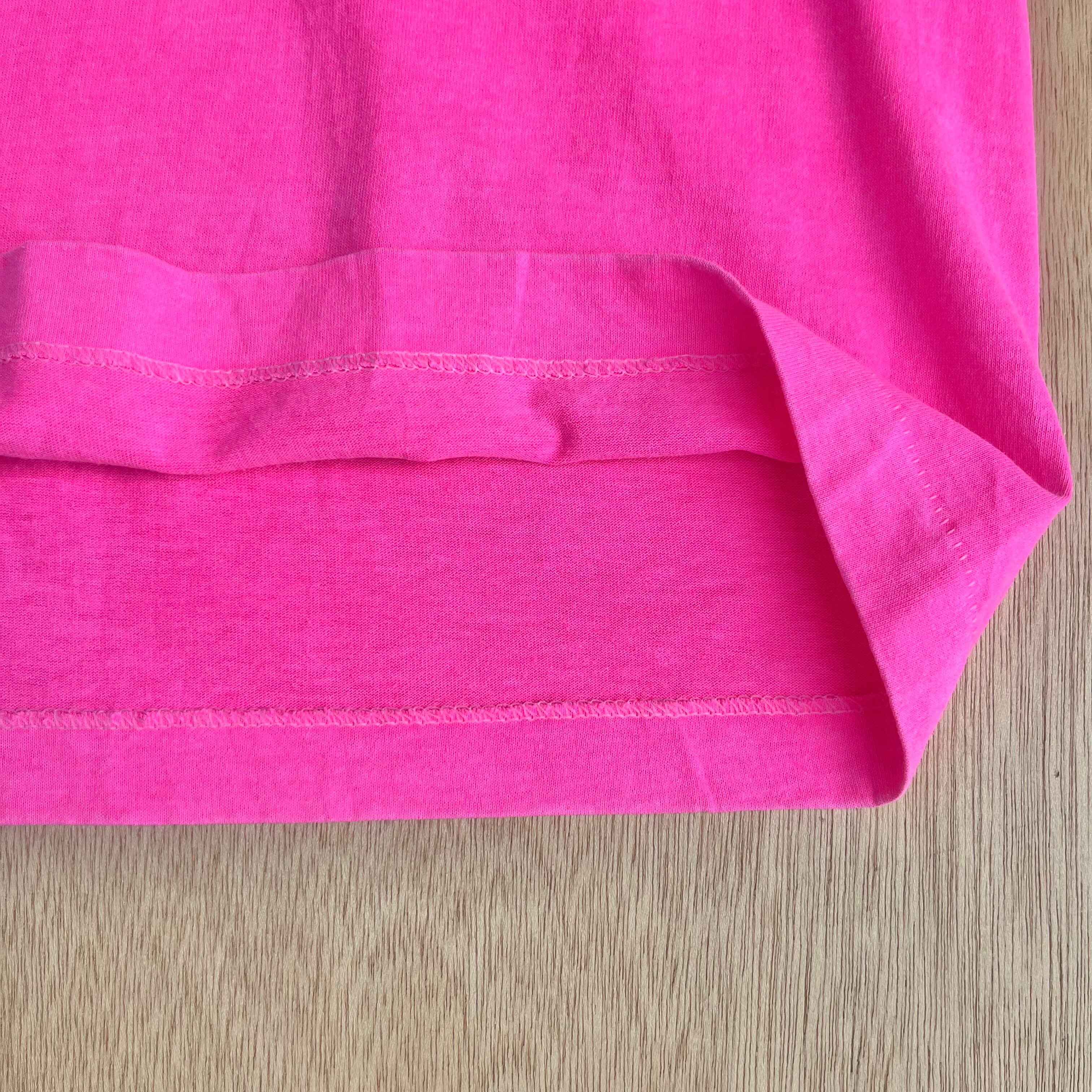ビビットなピンクがかっこいい90年代頃の幼稚園・保育園のTシャツです。ピンクに水色のロゴも映えますね。真ん中のイラストもとってもキュート。少しまだらな感じも素敵です。差し色に使ったり、シンプルにデニムに合わせても様になりますよ。