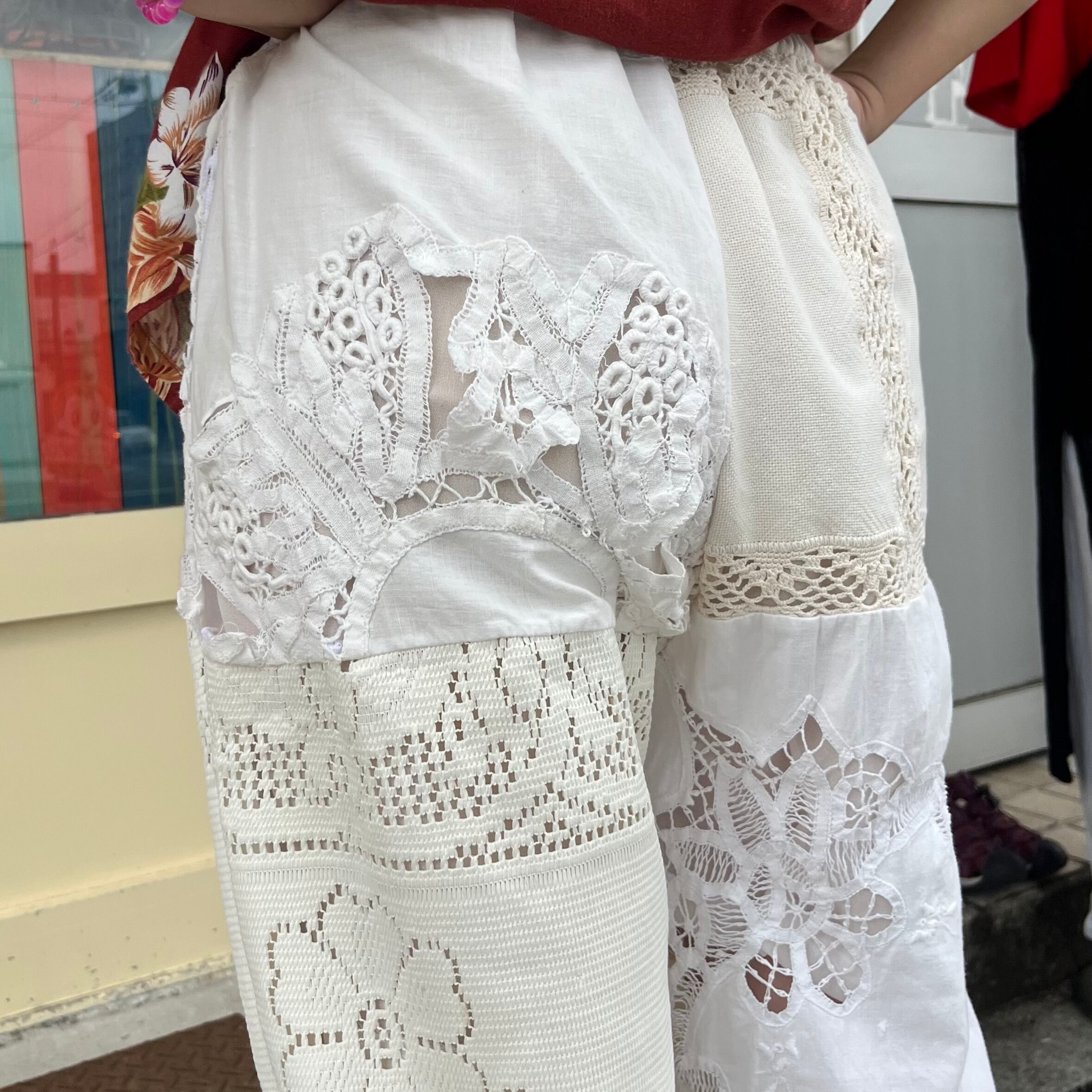こちらはUSEDアイテムを使用したリメイク商品となります。レース生地は古着のため、刺繍が解けている箇所がございます。目立ちにくいですが、股付近にチャコペンのような色が付いています。ご理解ある方のご購入をよろしくお願いいたします。
