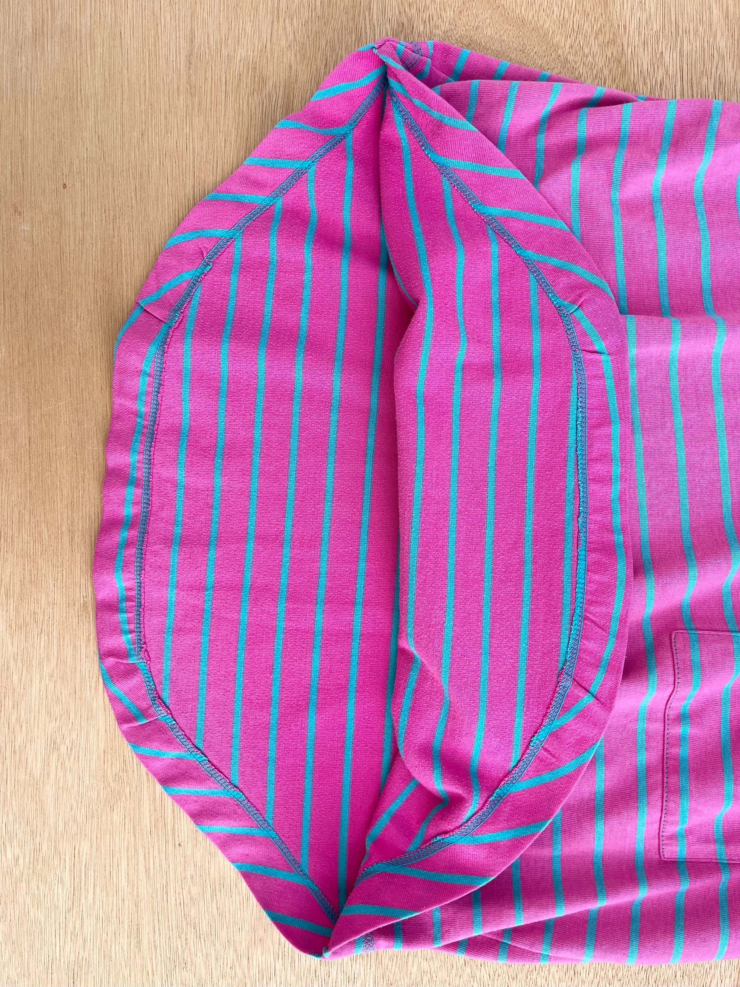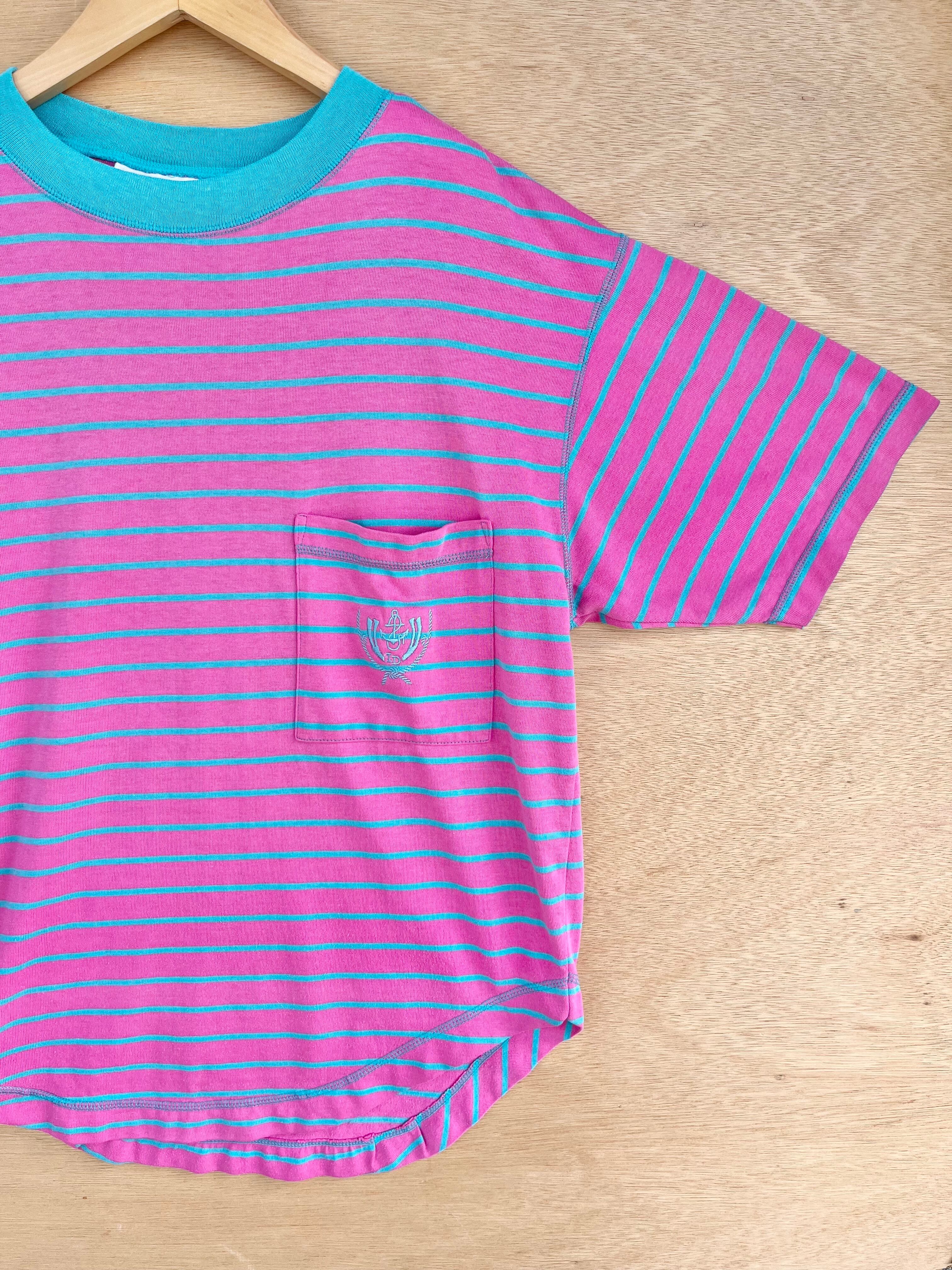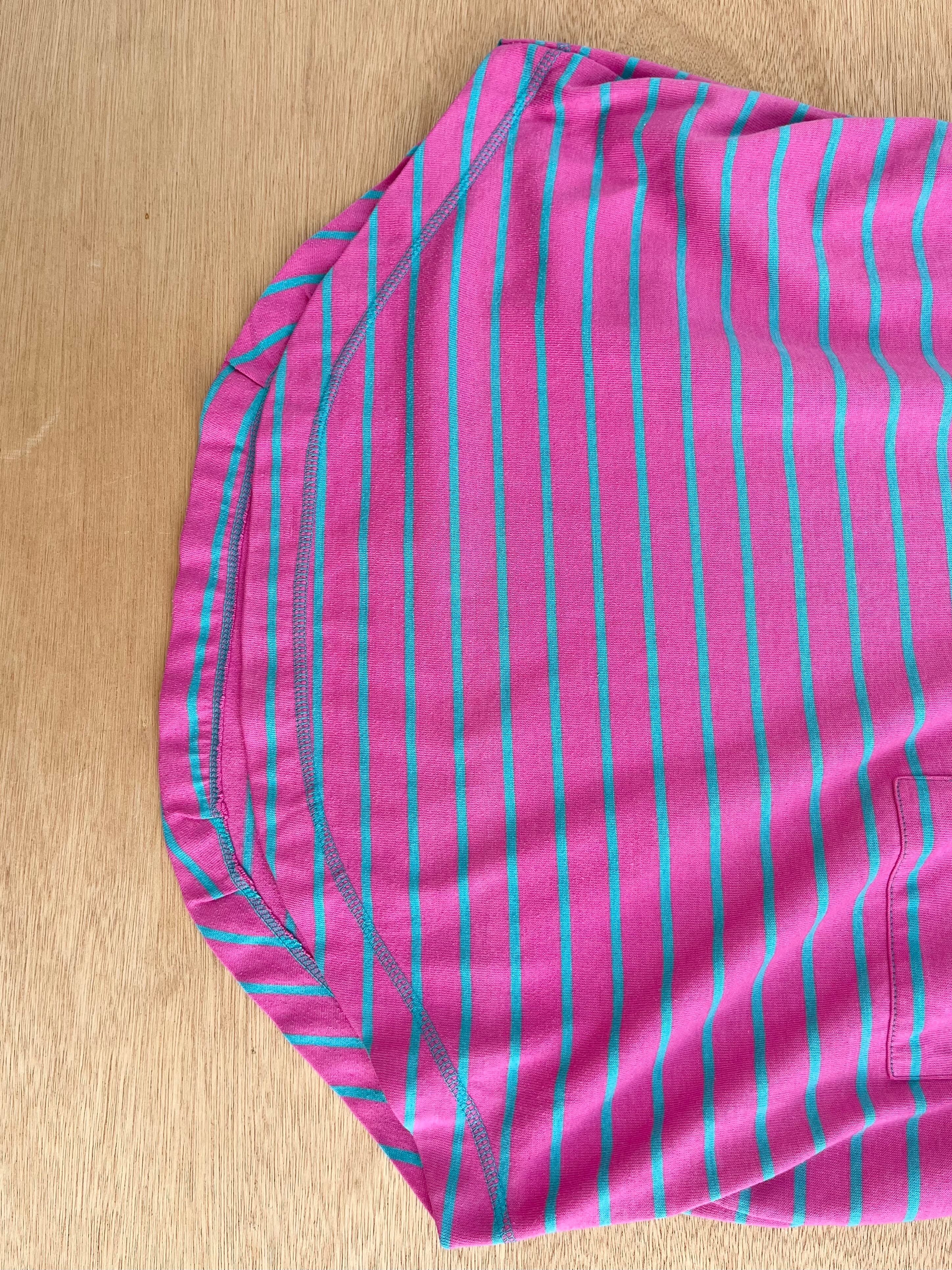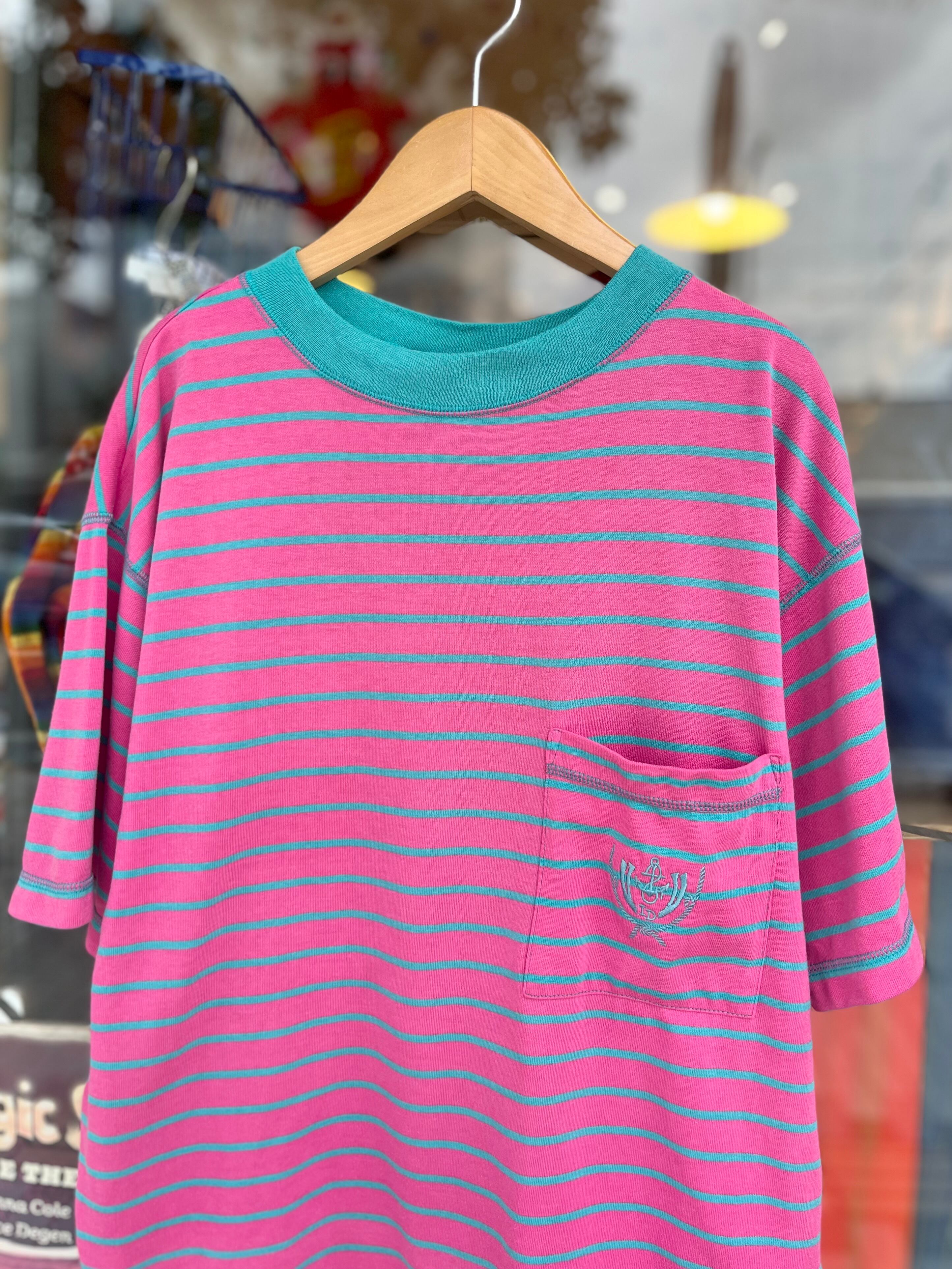 ピンクとグリーンのポップなボーダーtシャツです!色合いが鮮やかですね!裾がラウンドしているので、シンプルな合わせ方でも動きがでてまとまりやすいと思います。ショーツにハット、ビーサンでカジュアルなサマースタイルなど。ラフに着用できそうです!