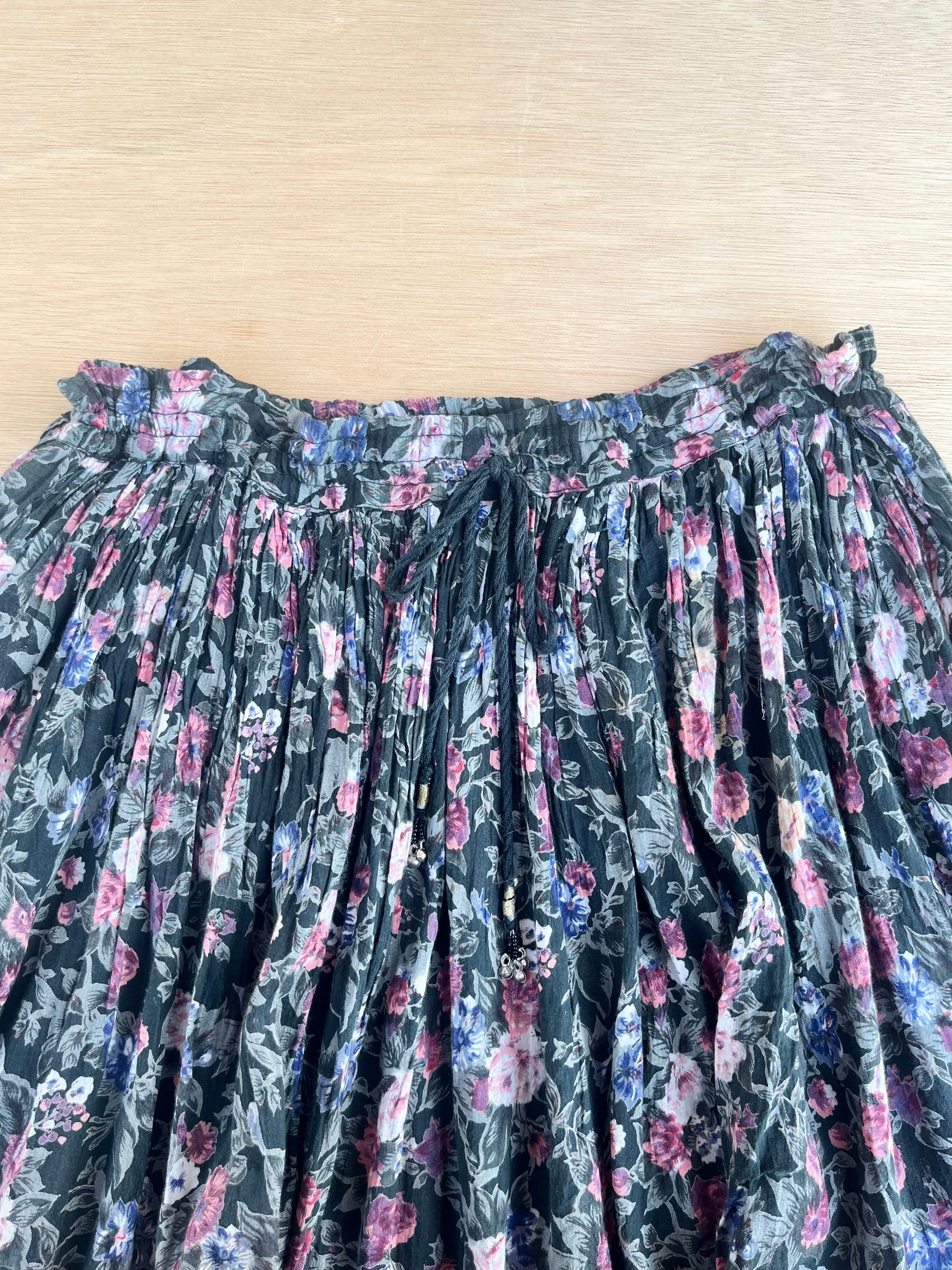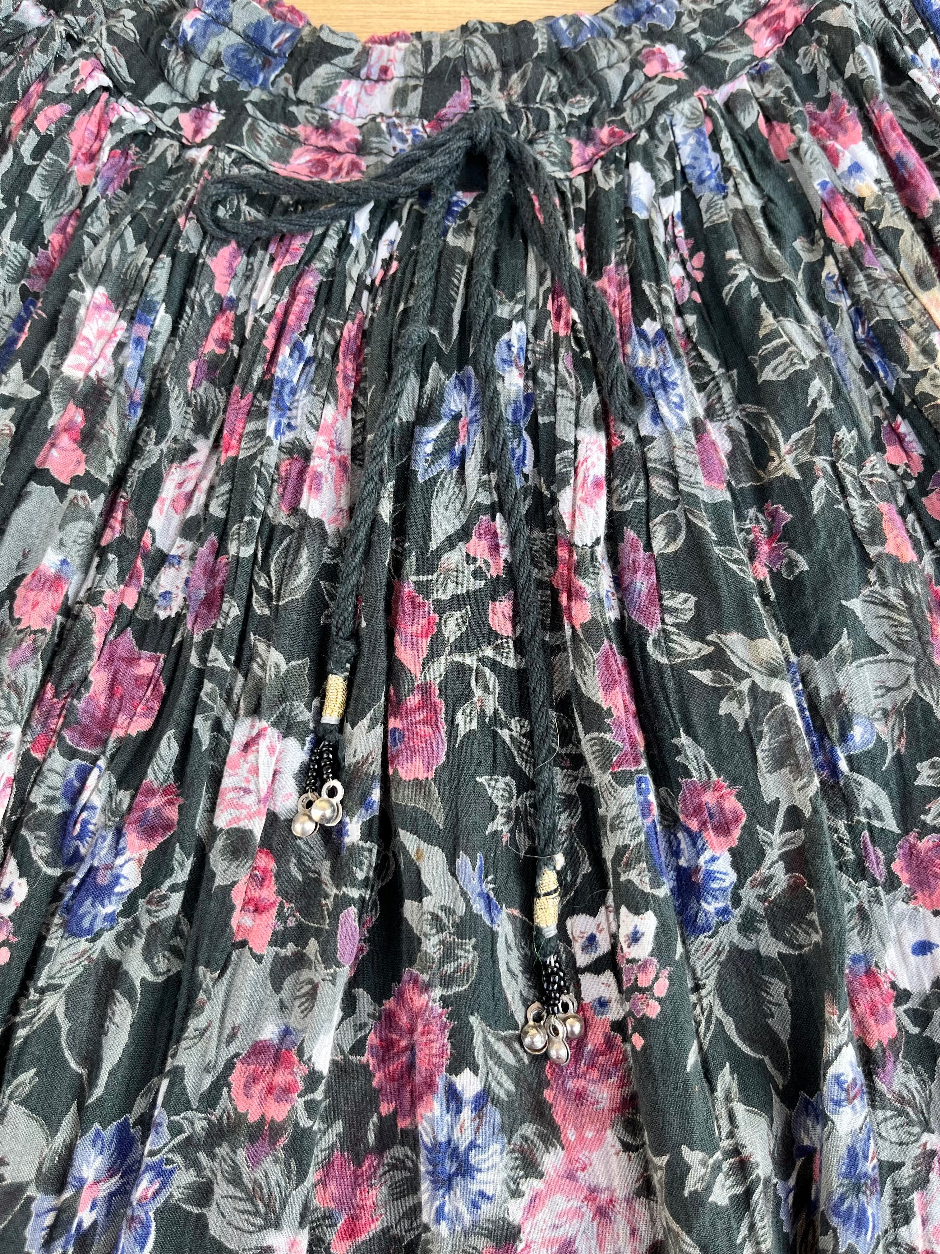 ダークグリーンにピンクのお花が映える膝上くらいのスカートになります。細かいギャザーでふんわり感のあるレーヨン生地です。透け感があり、レイヤードに使う場合も軽やかで重くならないのもいいですね!色味が落ち着いていて可愛くなりすぎないので、ベーシックな洋服と合わせても素敵ですよ。