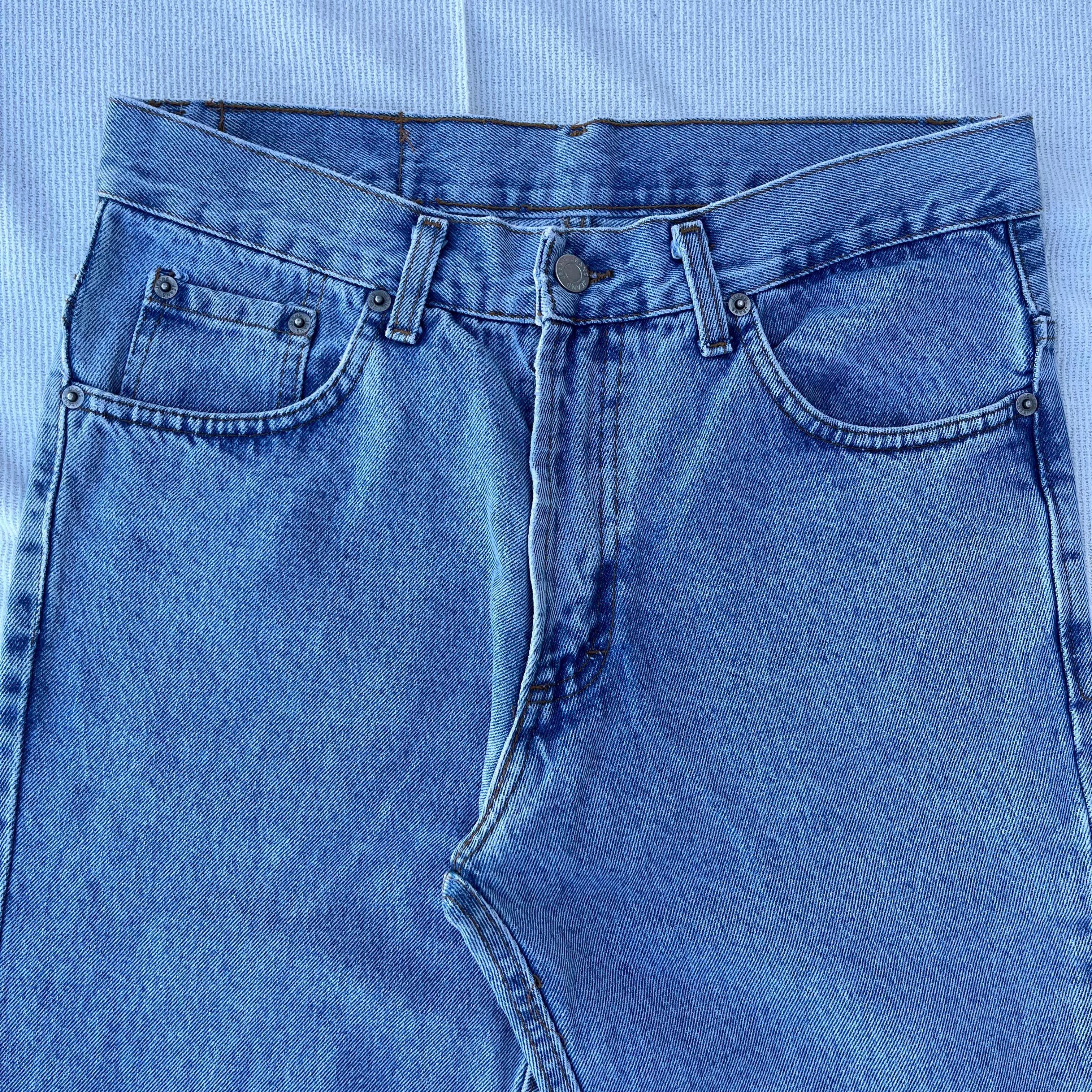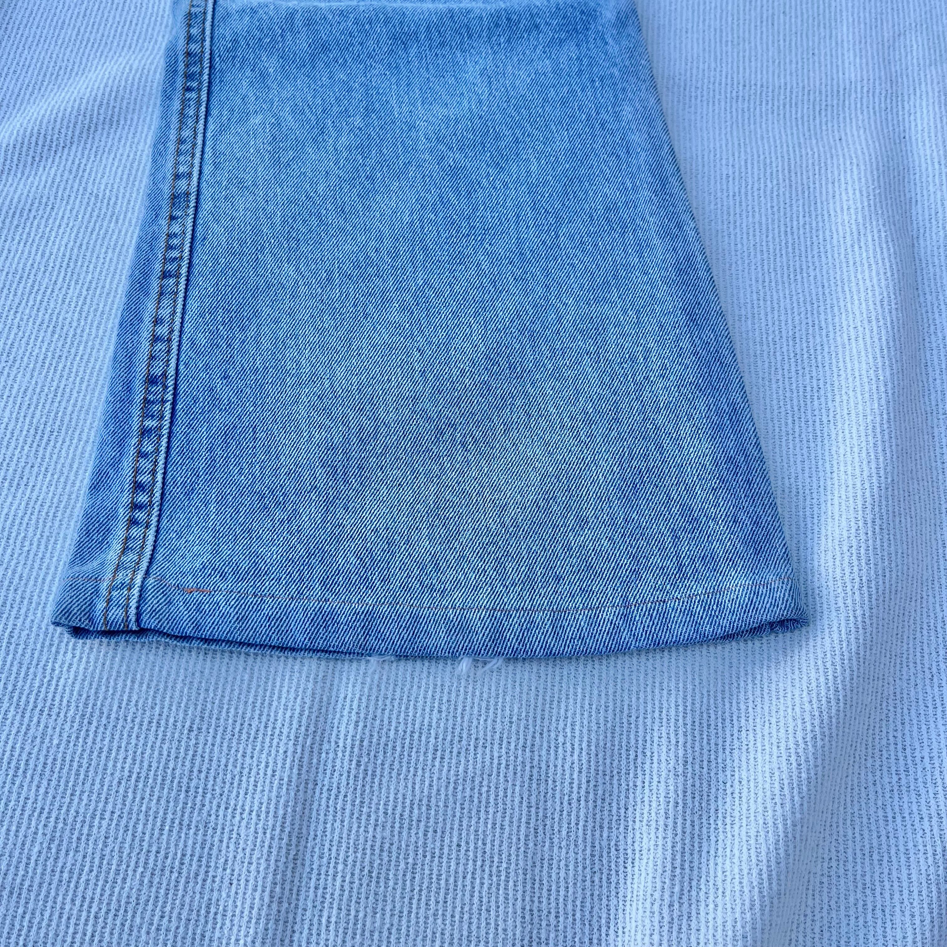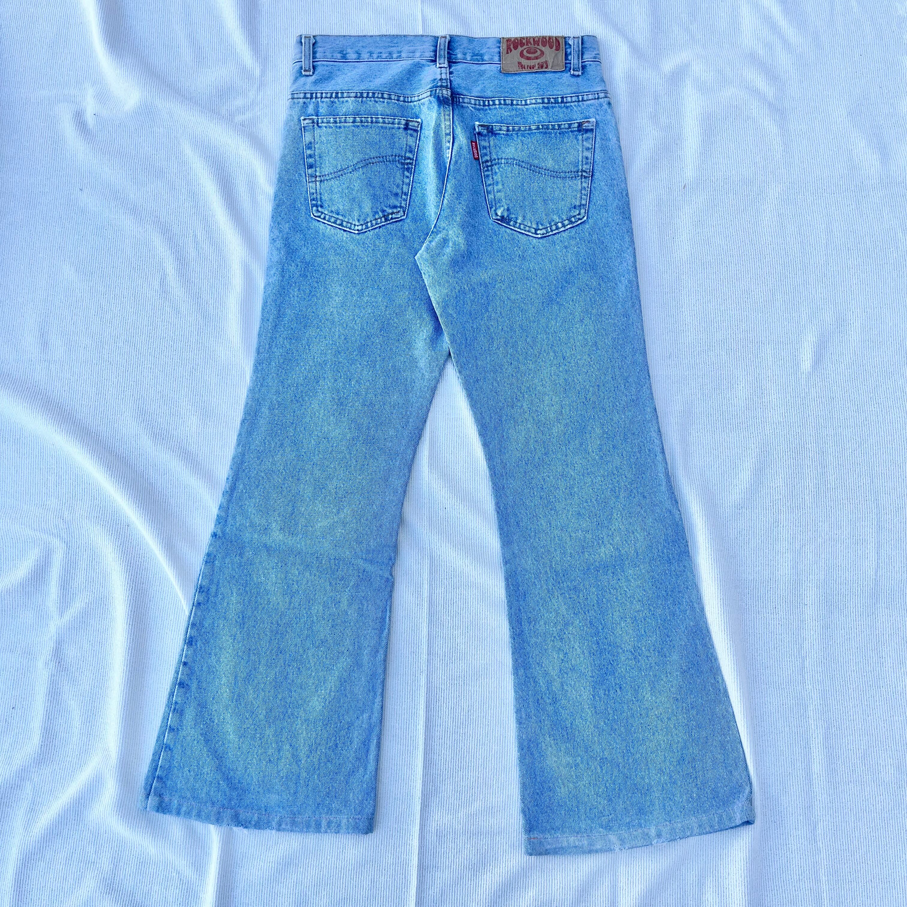 明るいライトブルーのROCK WOODフレアデニムです。程よいフレアシルエットが魅力的で合わせるアイテムを選ばず、着回ししやすいですよ。着丈の短いワンピースなどの下にレイヤードしたり、小さめのトップスと合わせて70sっぽく着るのもかっこいいですね。