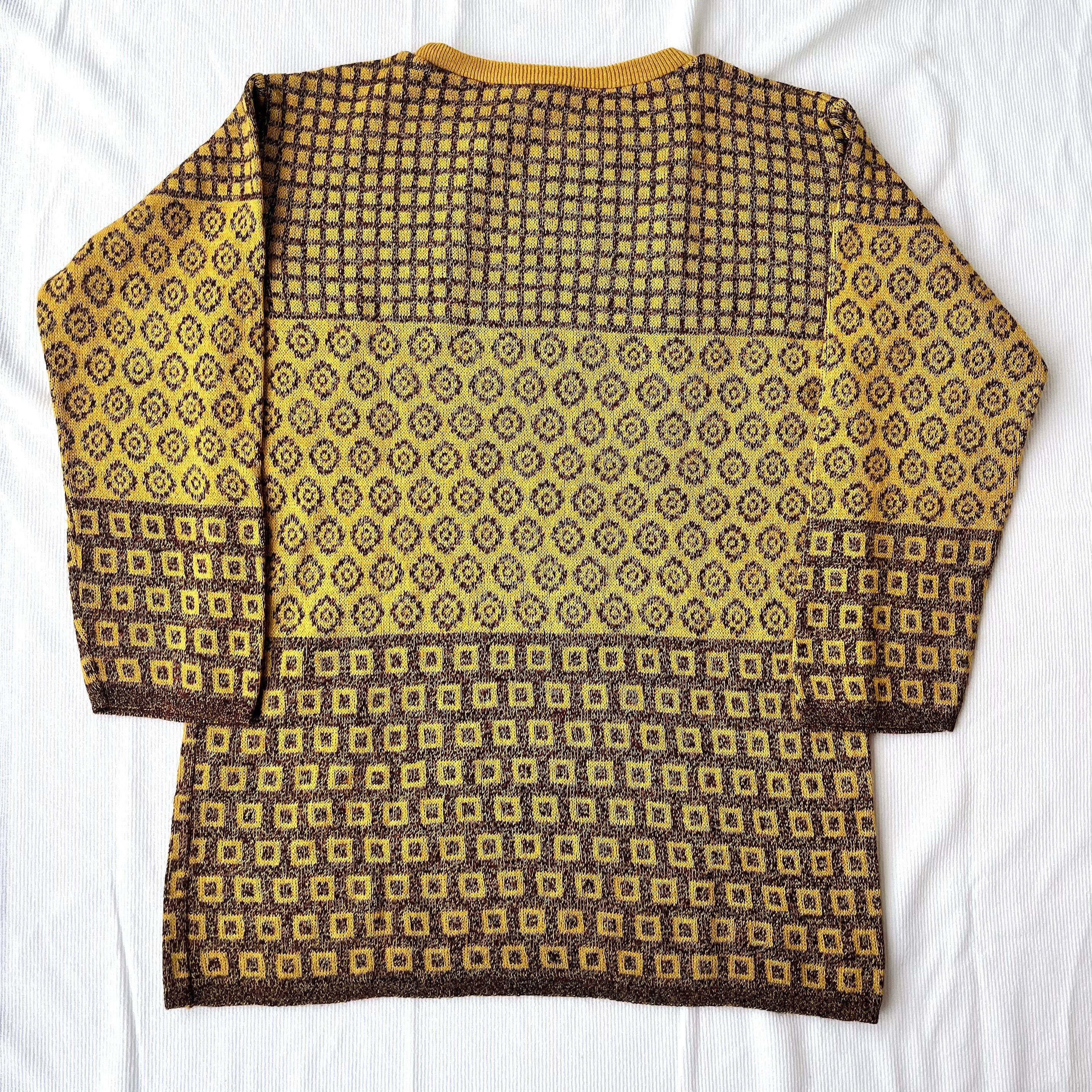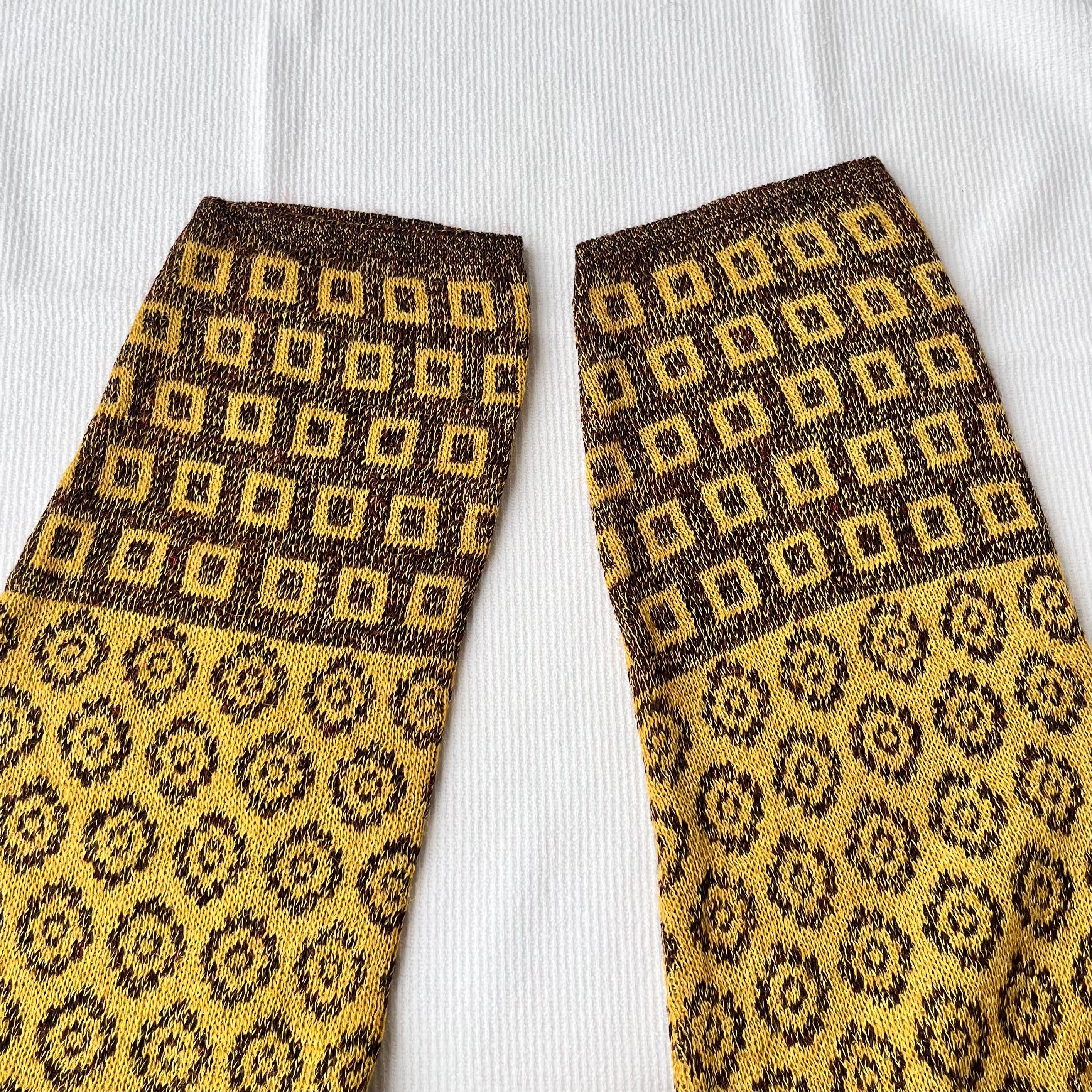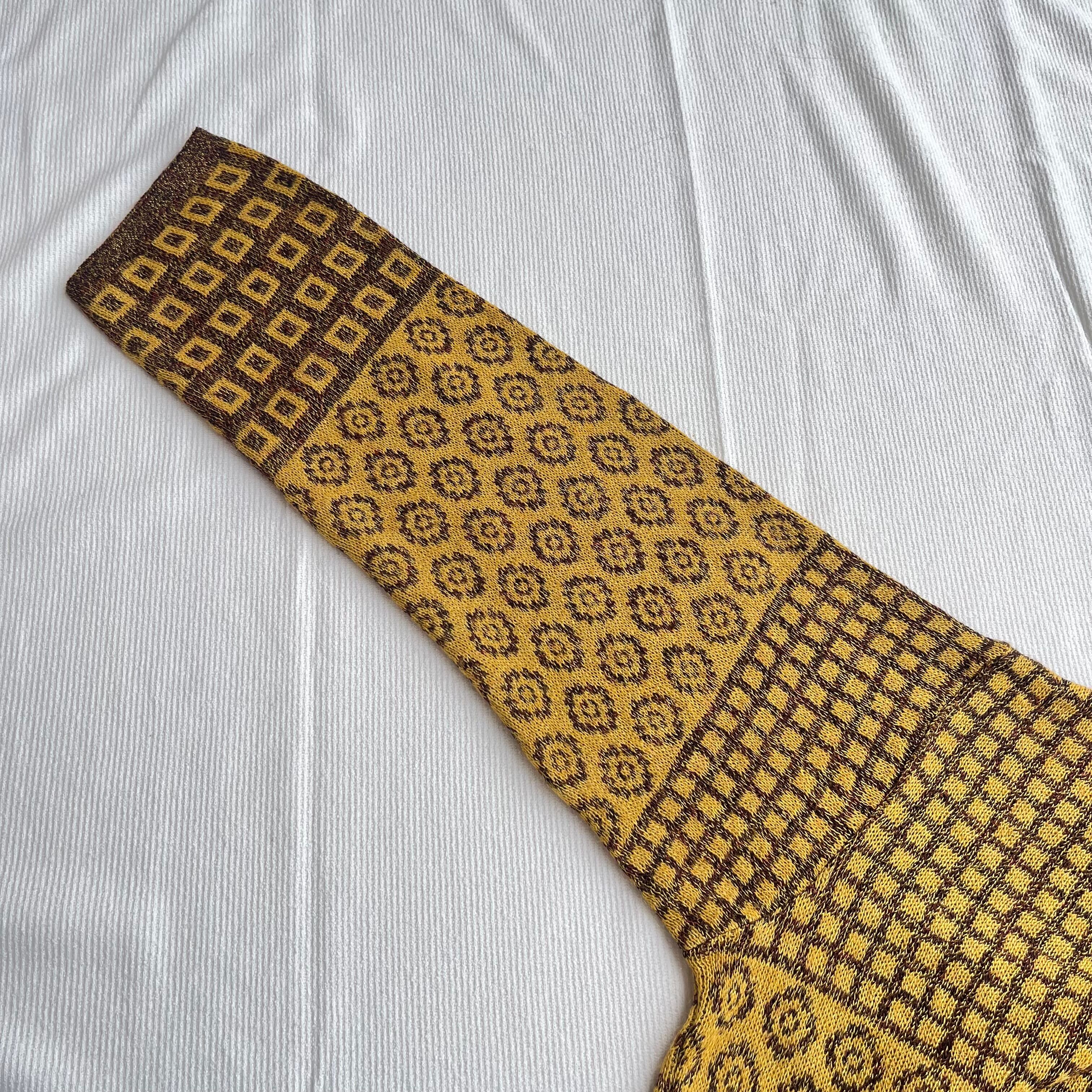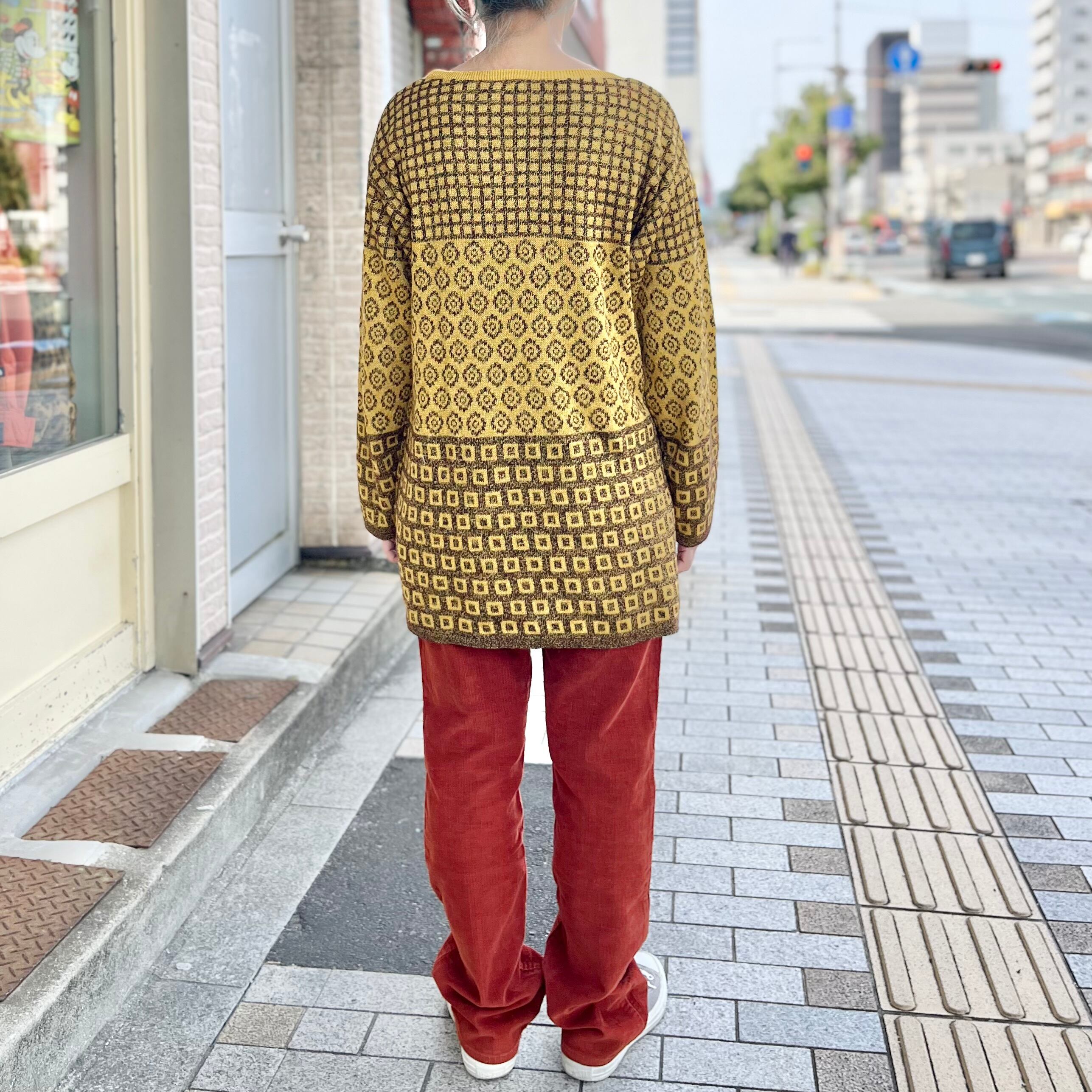 近づいてみるとイエローに光沢のあるワインレッドの糸が混ざっていてキラキラ感も可愛いです!遠くからの印象はイエローとブラウンのニットの色味に見えて合わせやすいです。チュニック丈のニットなので、スカートで合わせても可愛いですし、ロングブーツを合わせるのも良さそうです!