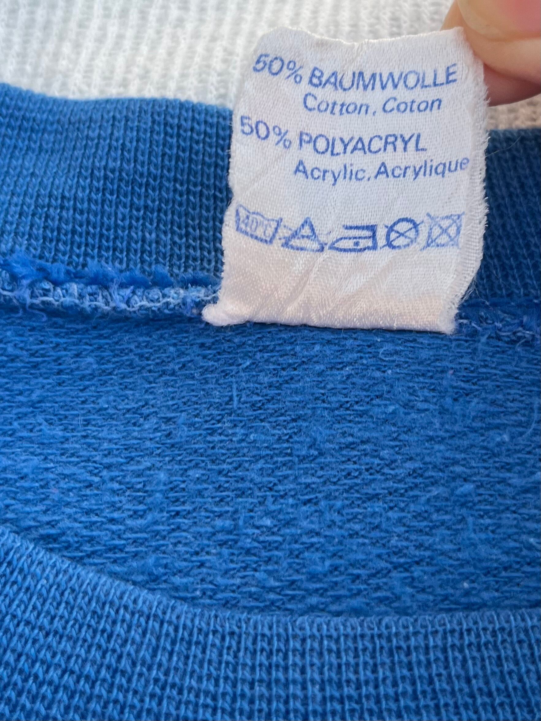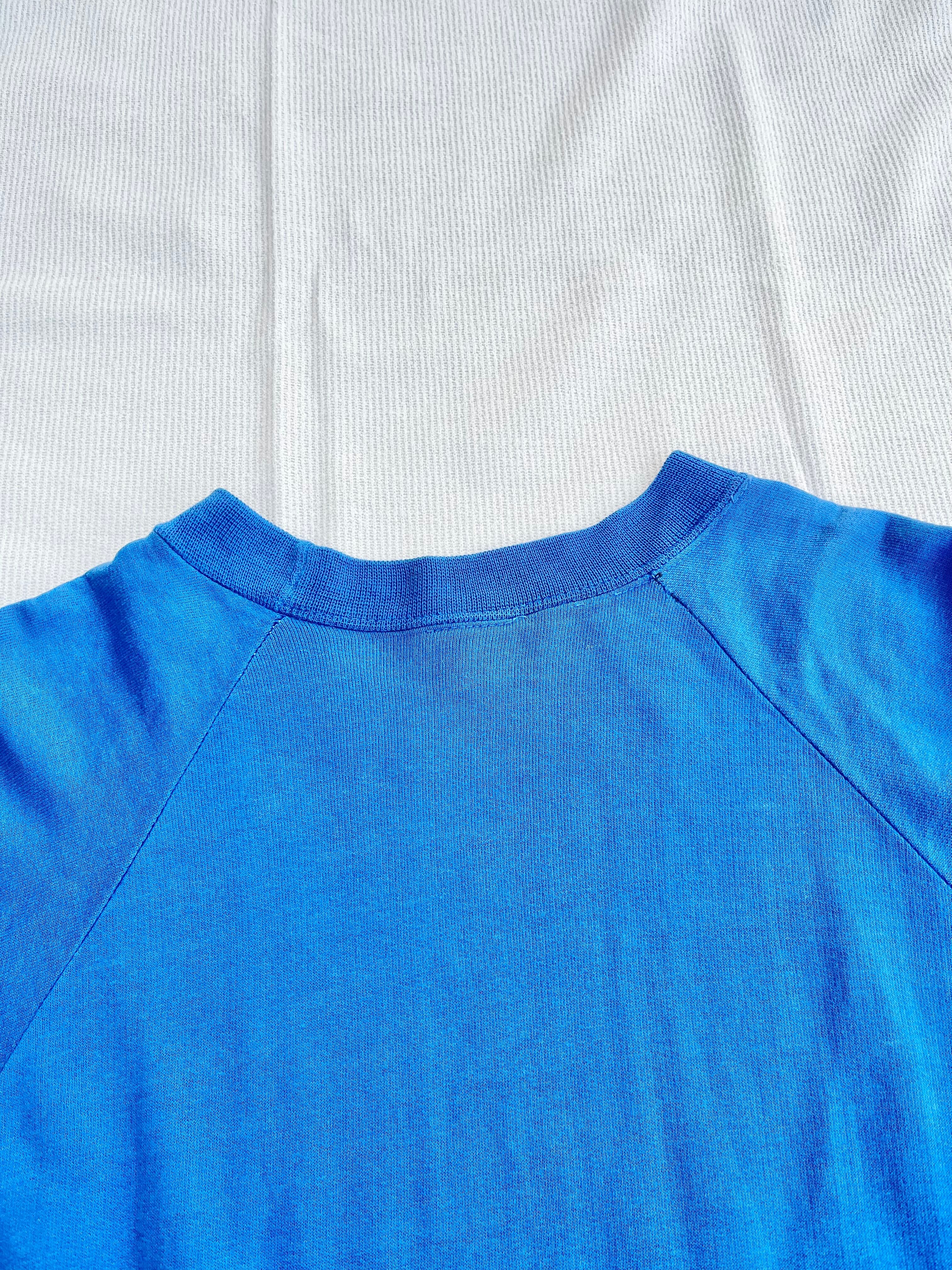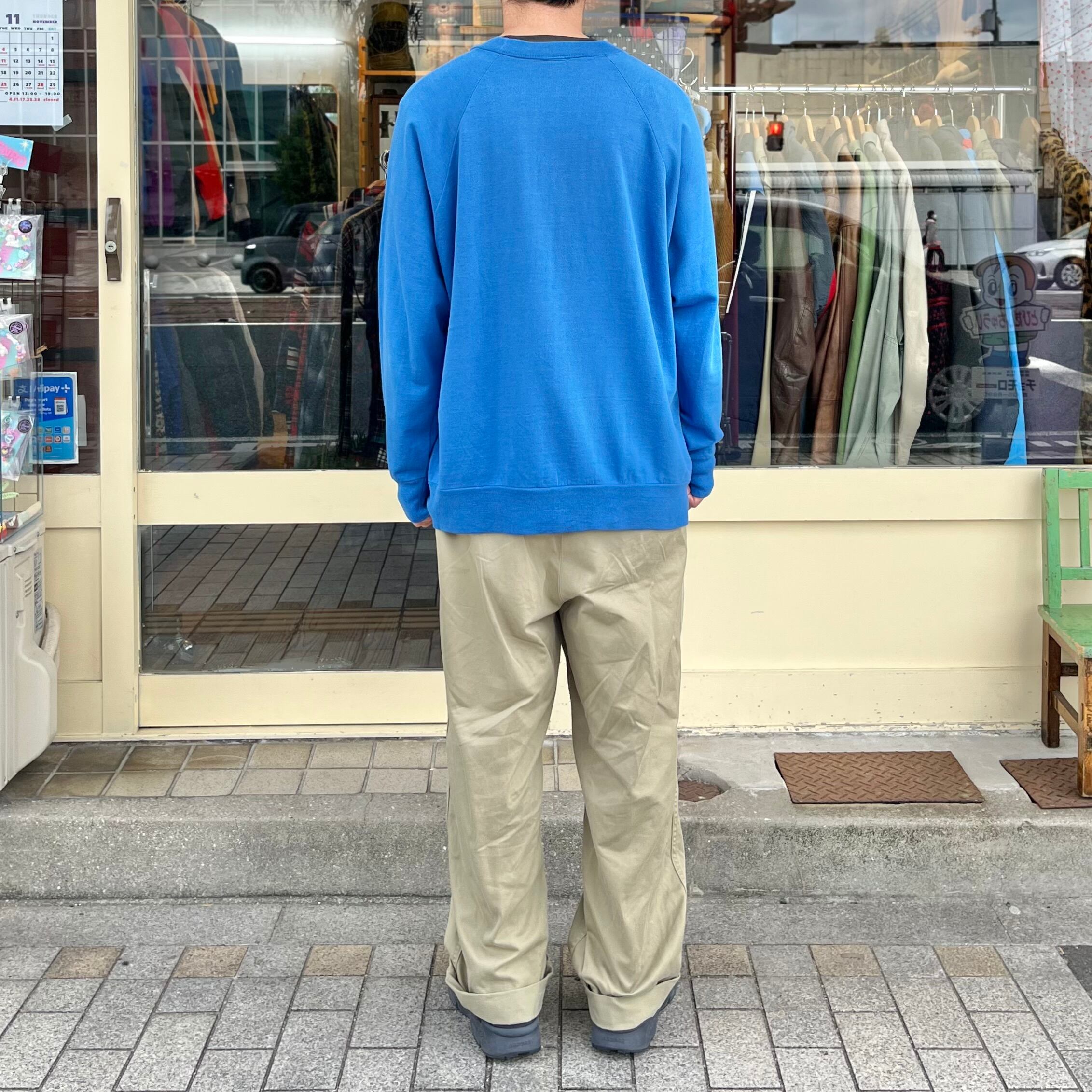 コットンアクリル素材の滑らかな質感のスウェットになります。薄さはロンTとトレーナーの間ほどで分厚くない為、春先等も着用できますよ。水色の色合いやプリントに年代ならではの味わいが出ておりかっこいいですね。