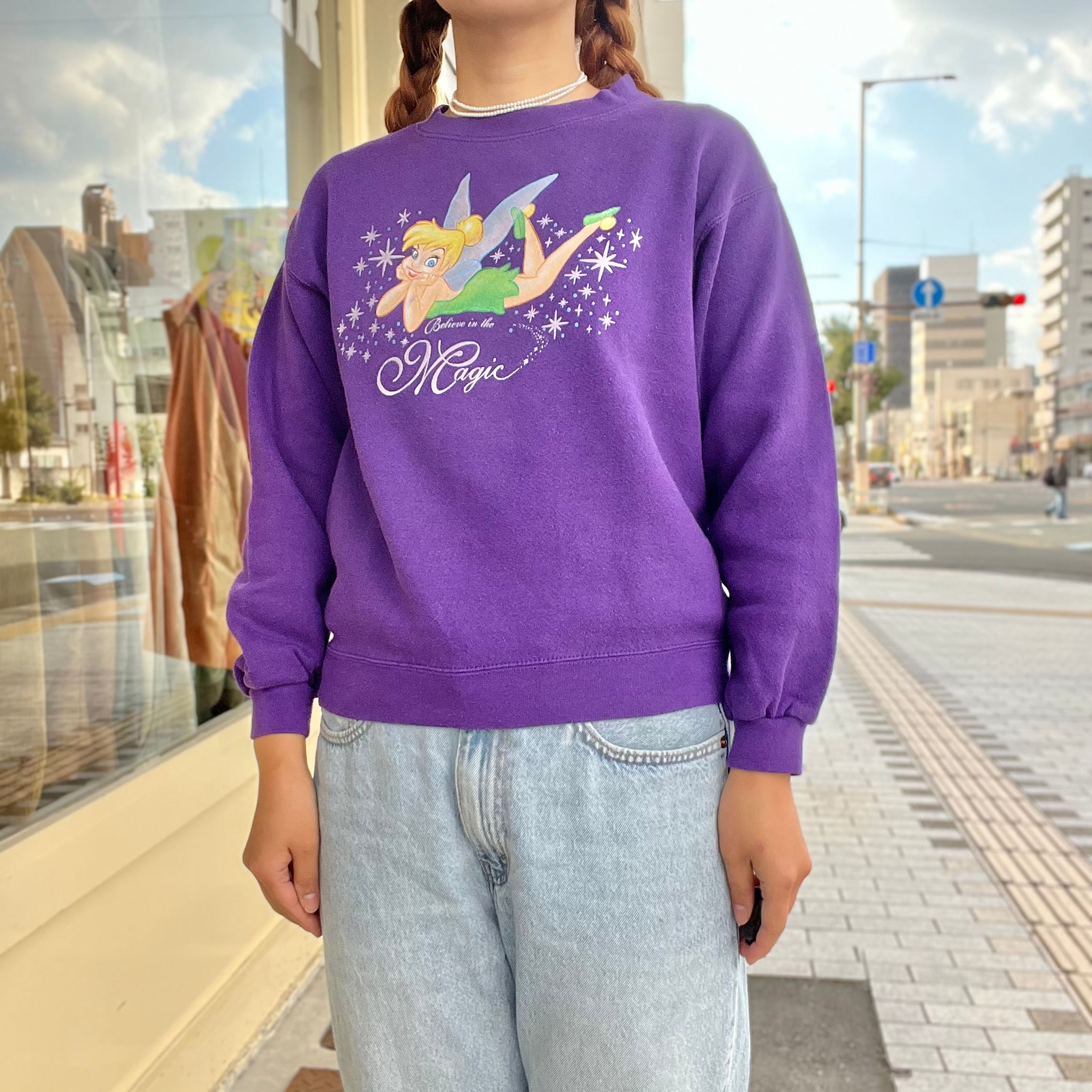 ティンカーベルのプリントがキュートなスウェットです!ティンカーベルのプリントのラメ感もパープルの色味もとってもかわいい一枚です♡小柄さんやジャストサイズでお探しの方におすすめなサイズ感です。カラフルにアメリカポップなテイストで合わせるのもかわいいですね!