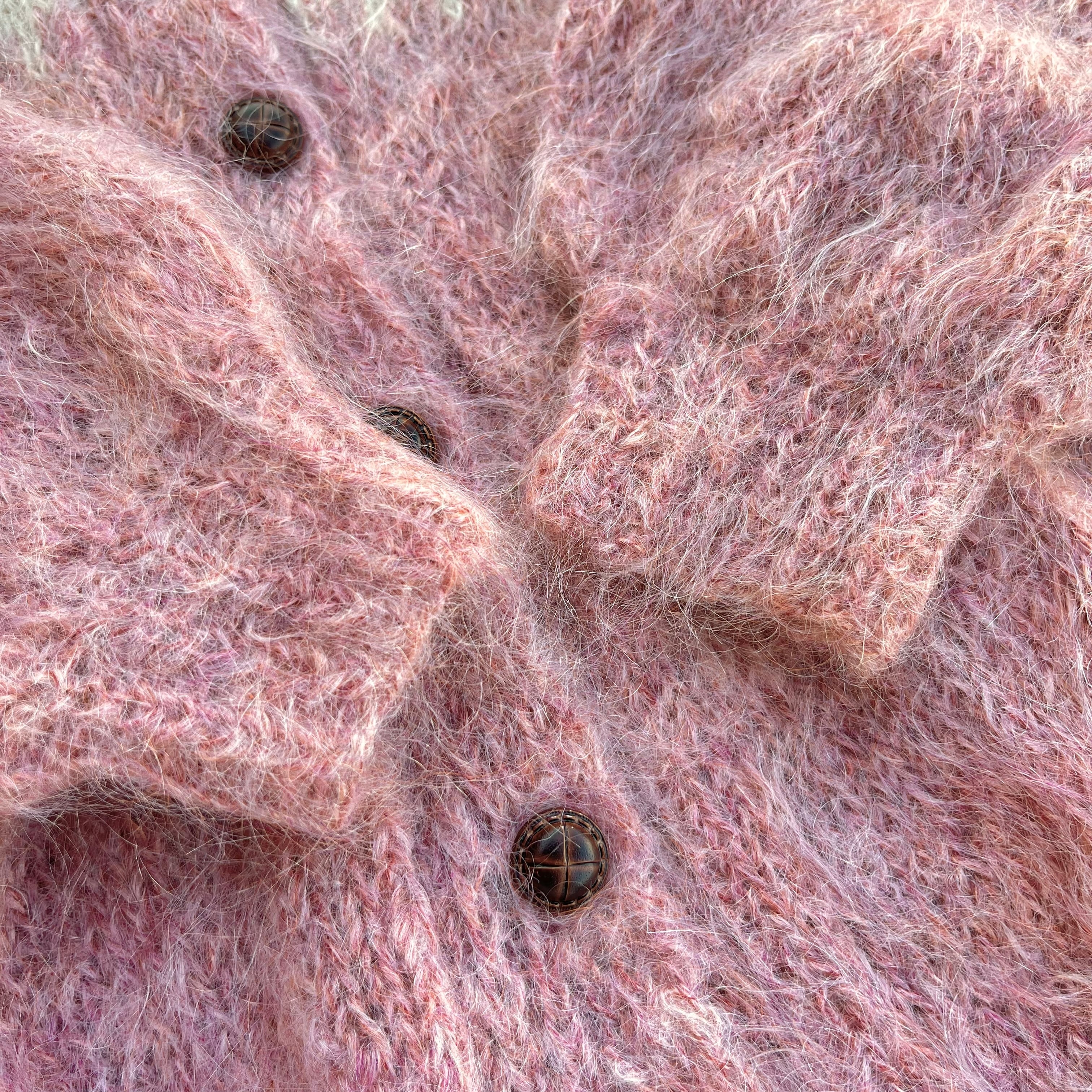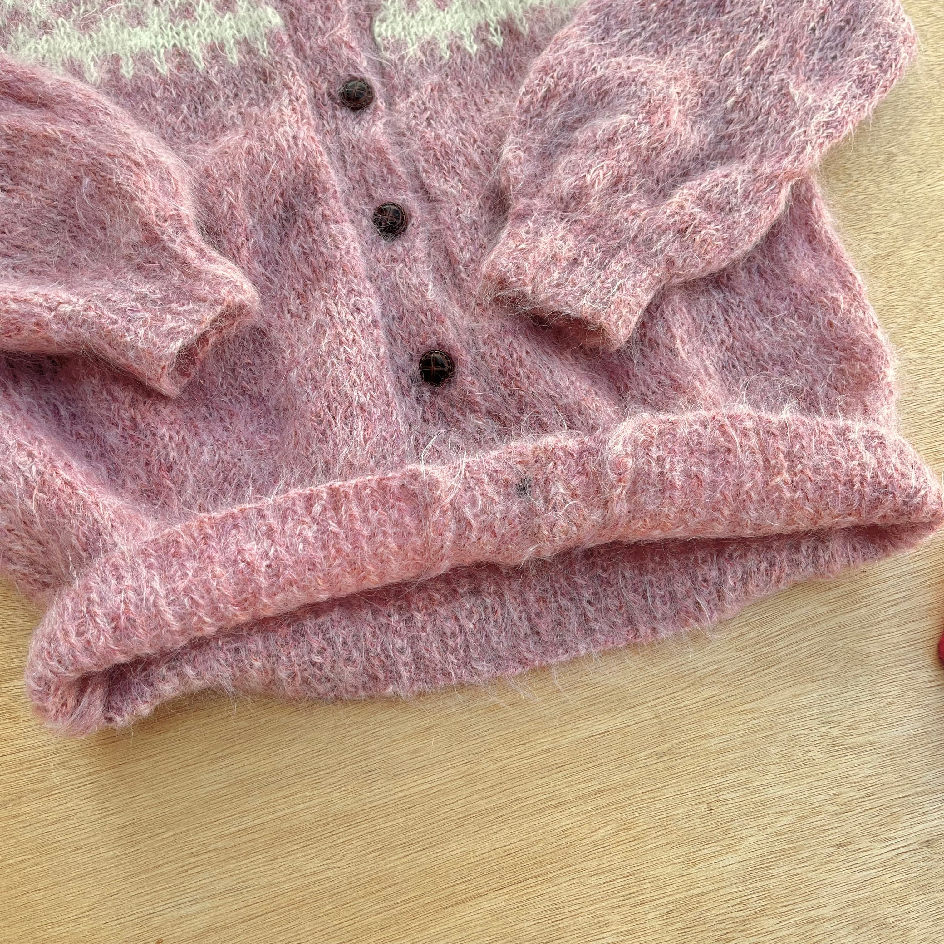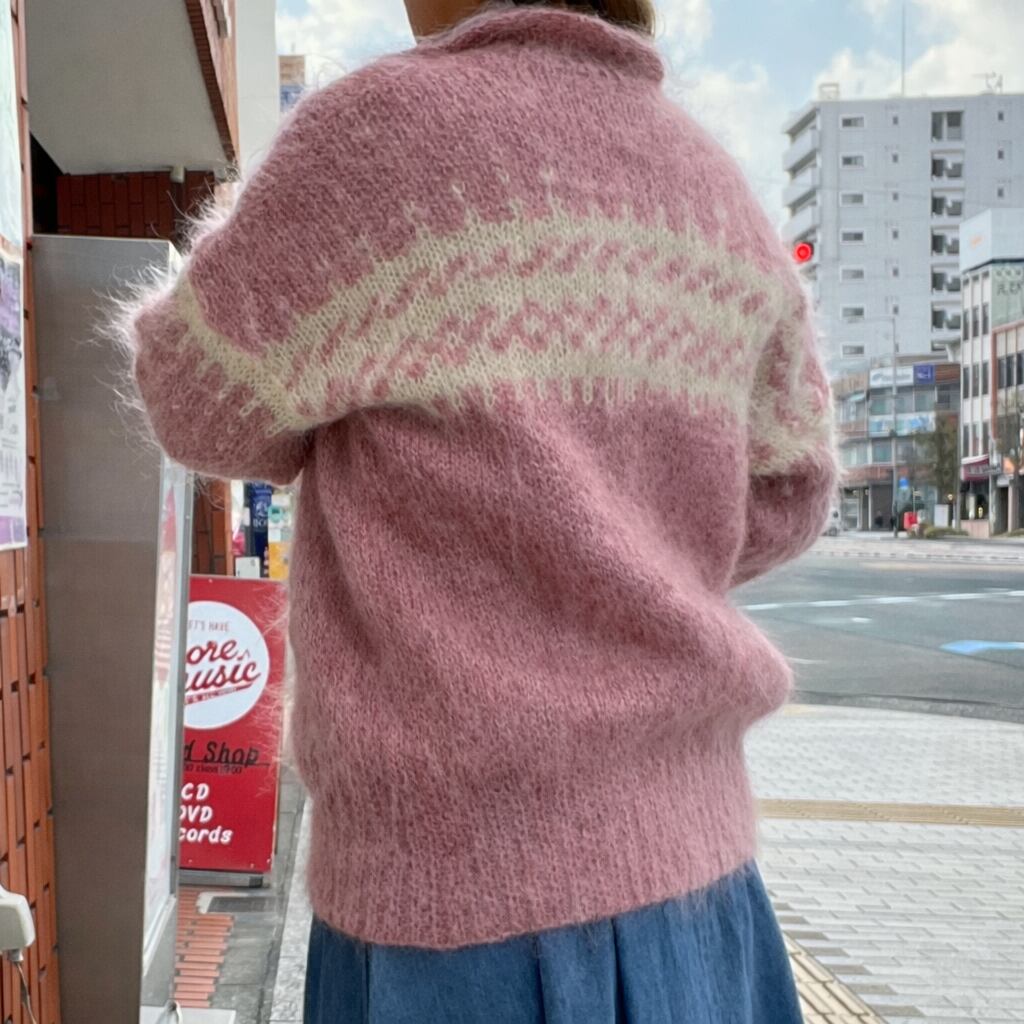 タグがついていないため、おそらくハンドニットアイテムかと思います。素材感は軽めで、ふわふわした柔らかいニットです♪春先の羽織にも長く使えると思います。着丈の実寸は長いので、安全ピン等で丈間調整したりと好みでアレンジ可能です。後ろに落として着ると前から見た時、襟周りにセーラー感が出て、可愛いです。(1枚目)