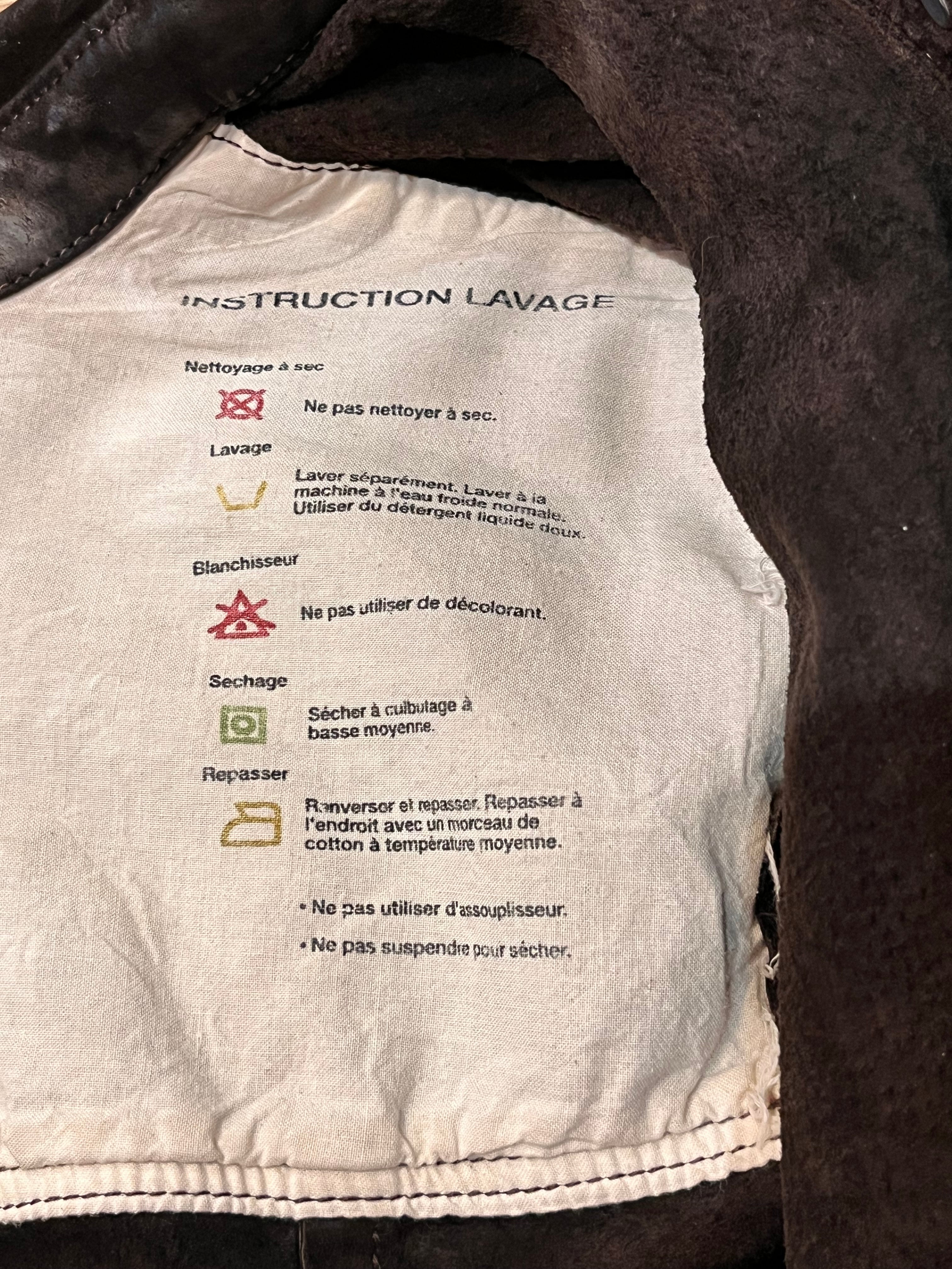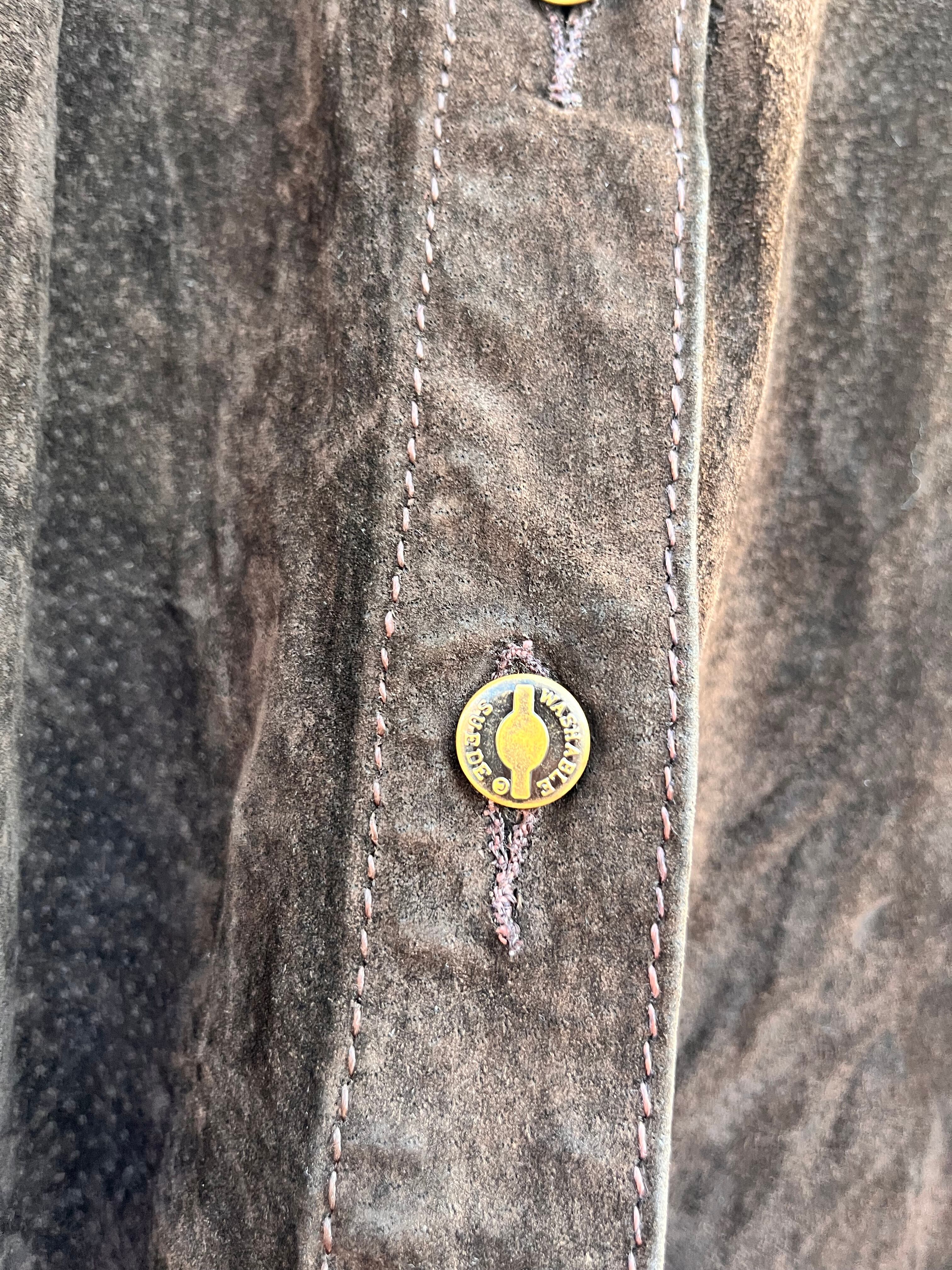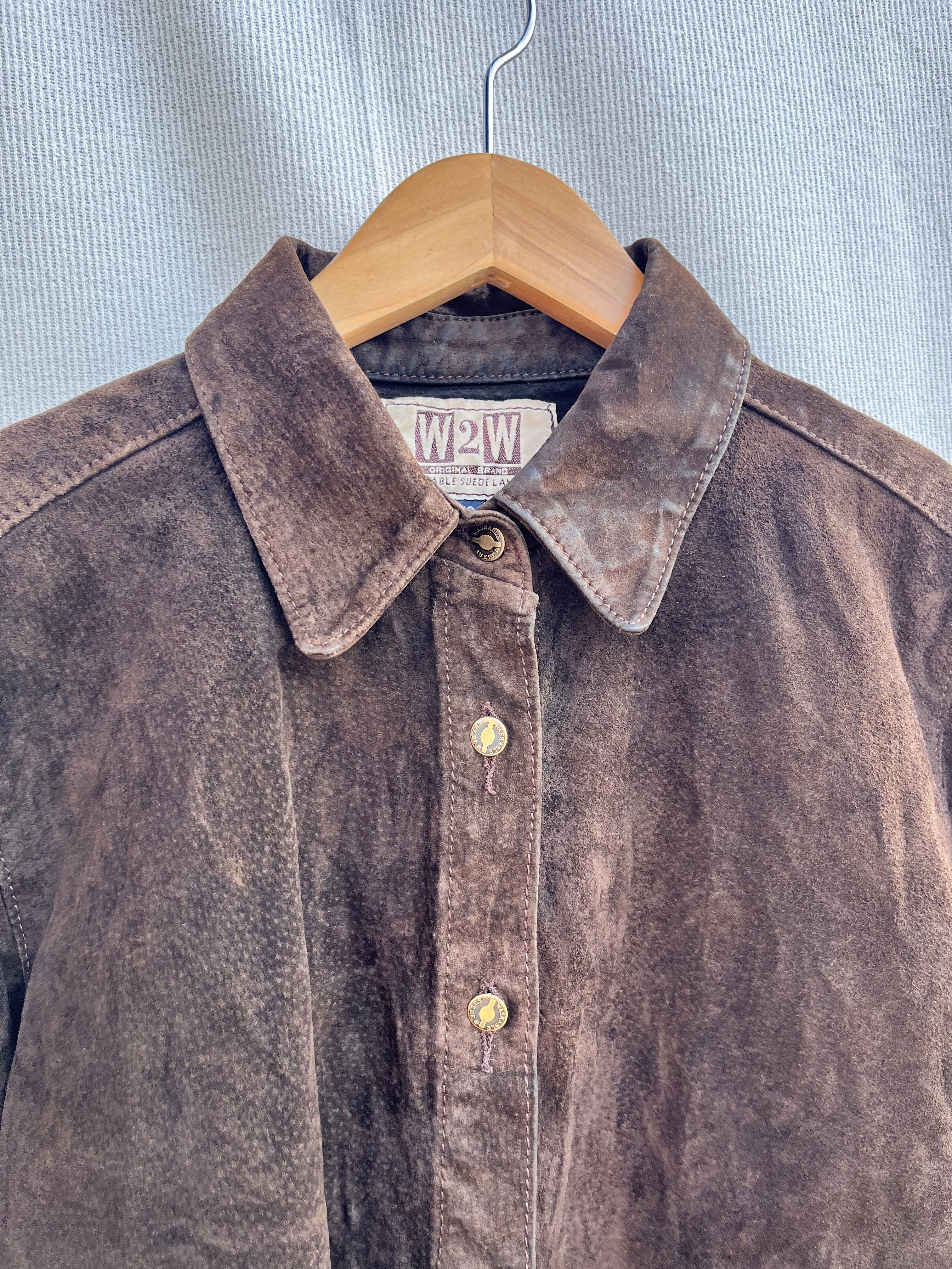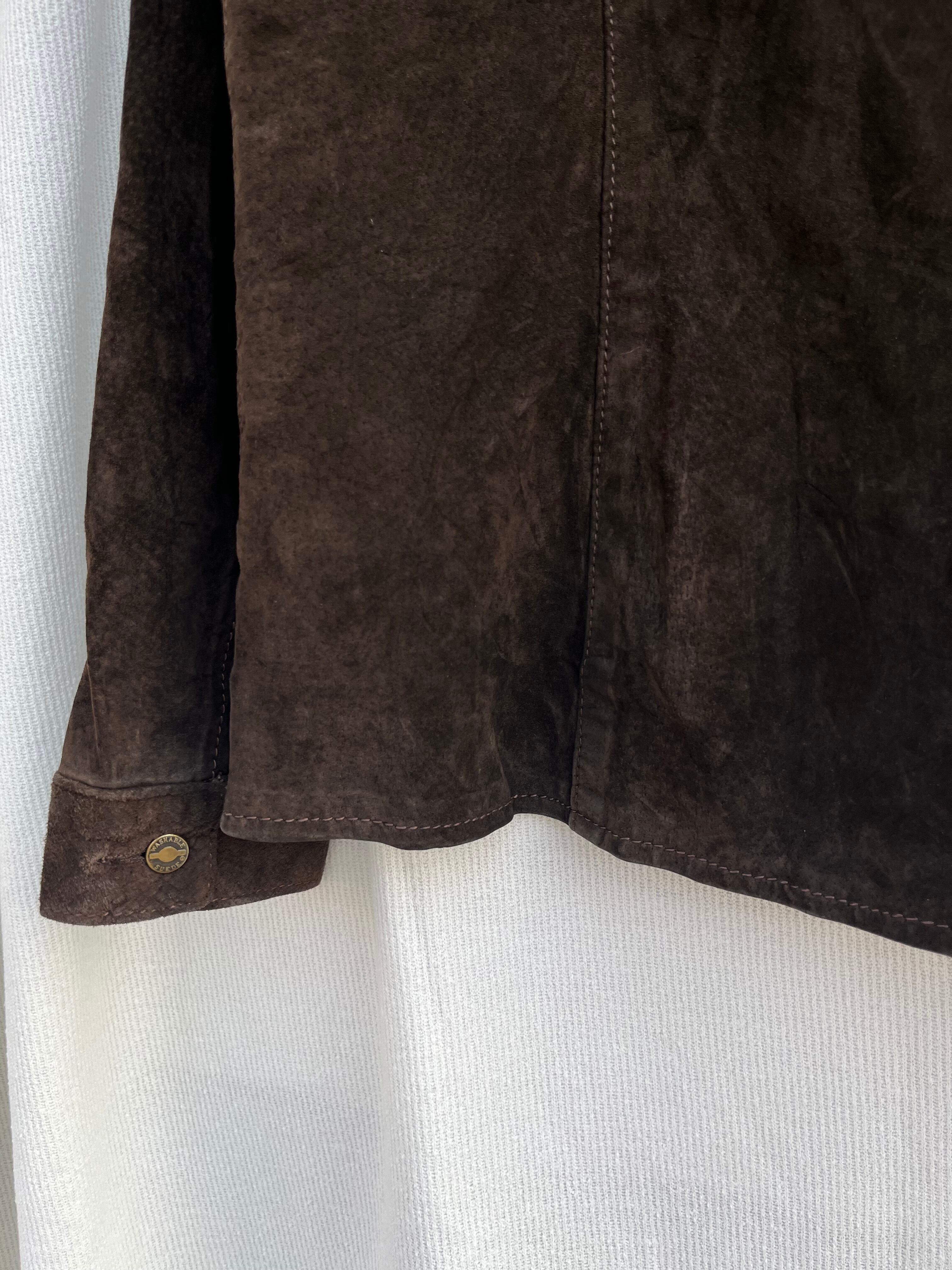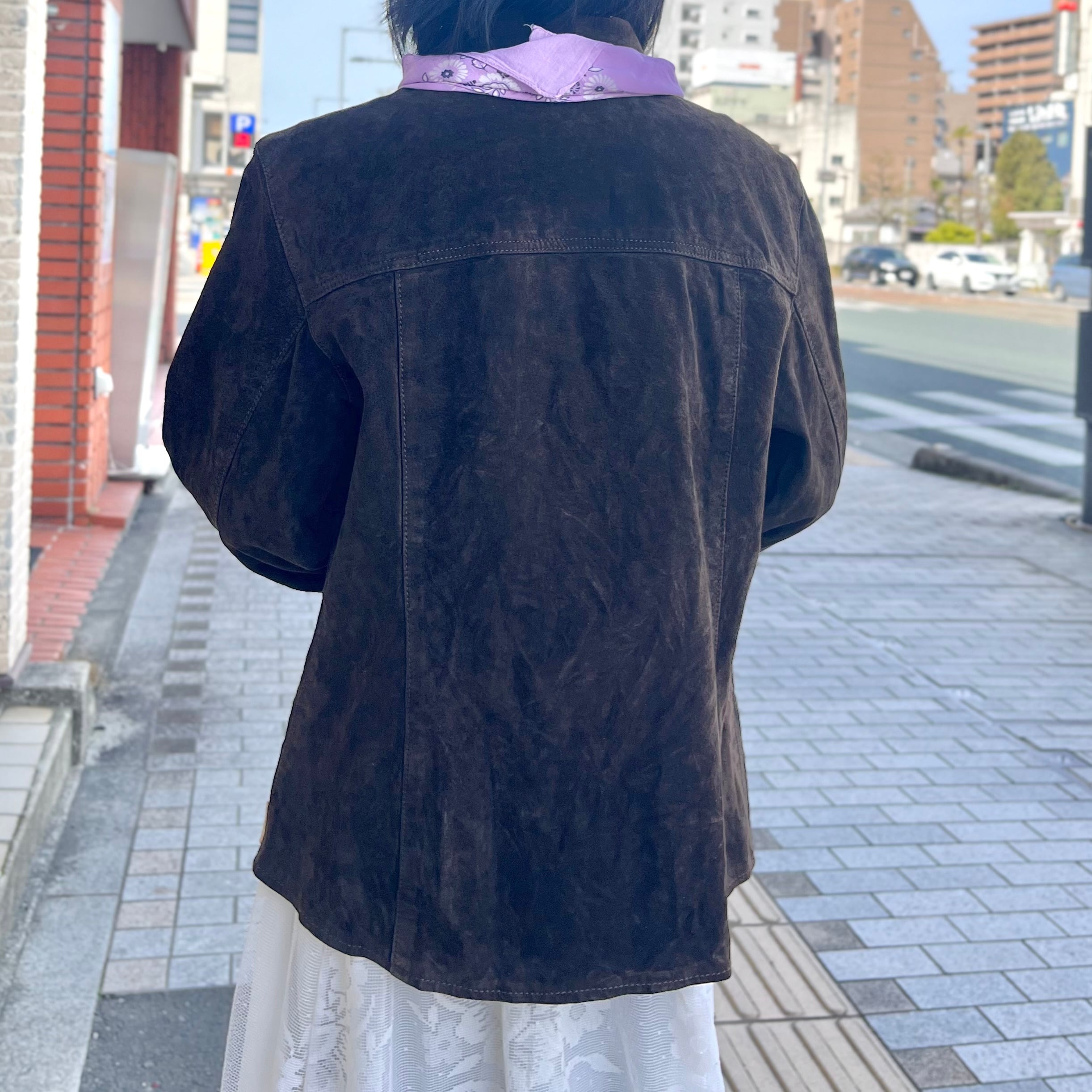 ブラウン色が可愛いスエードシャツジャケットです!厚みがないので、ボタンを閉めて上からベストやアウターを重ねても良さそうです⭐︎パンツスタイルに羽織っても古着らしさがでますね!レザーの重みは感じないので着やすい一枚ですよ。(着用身長 158cm)