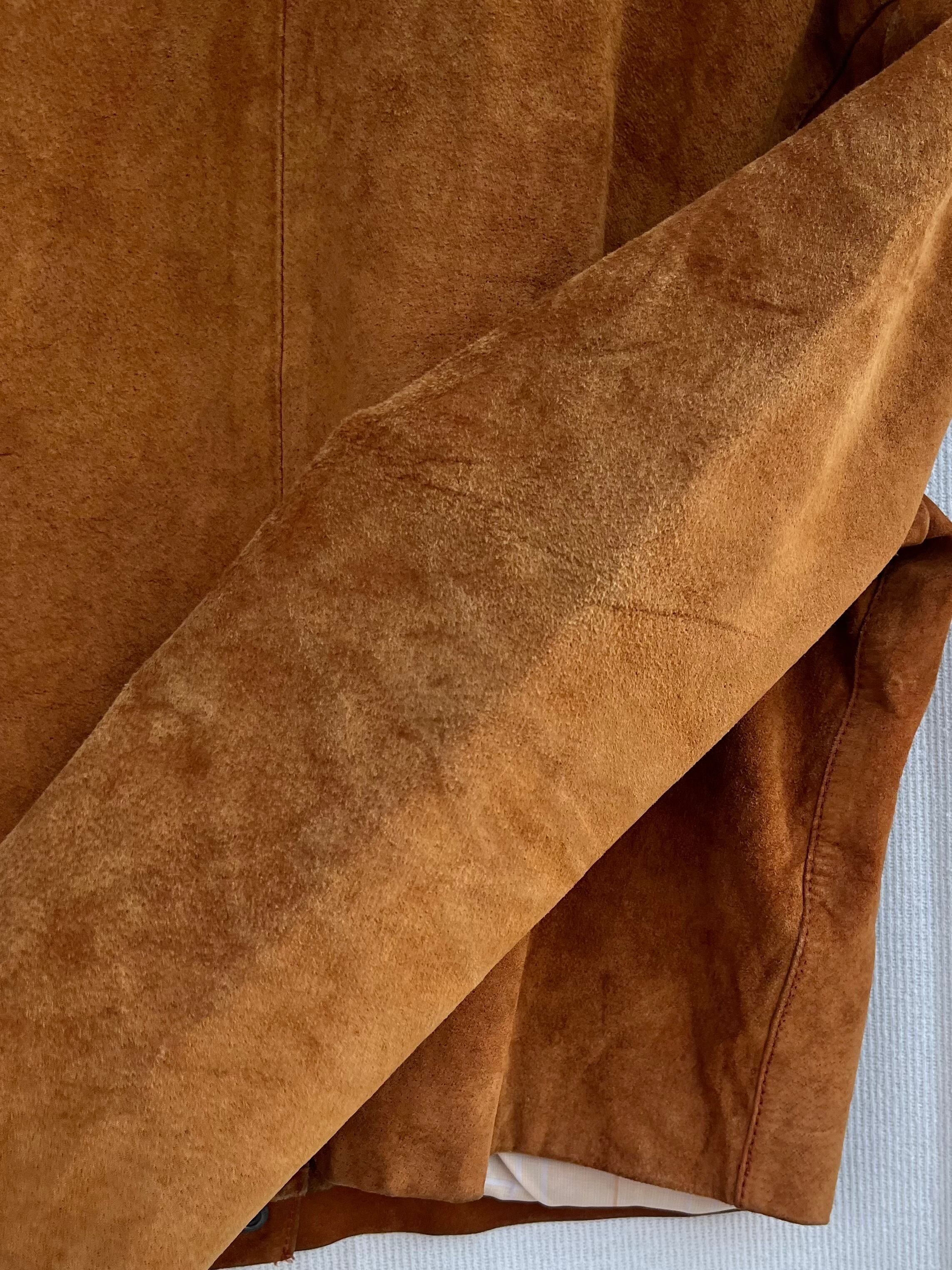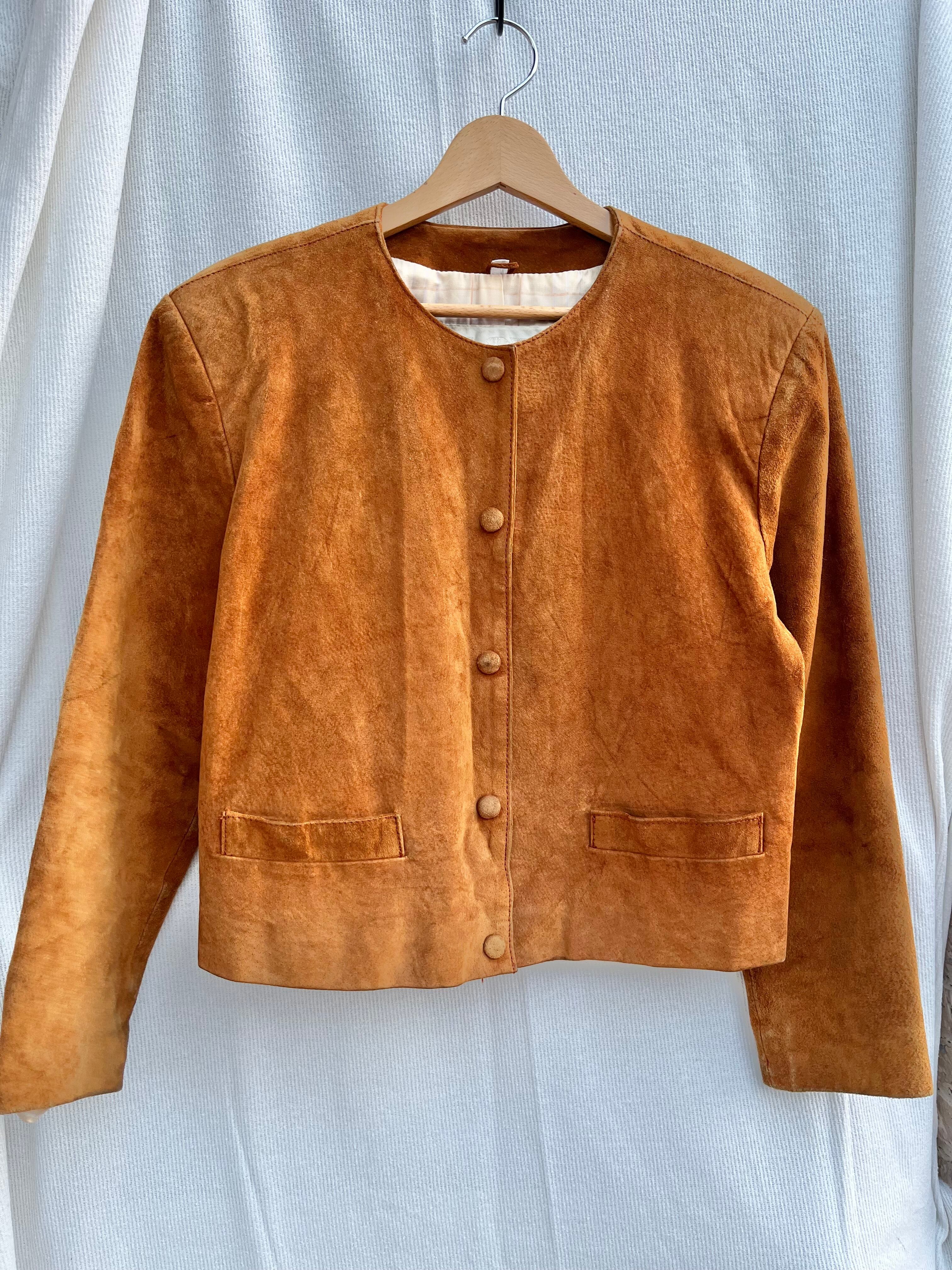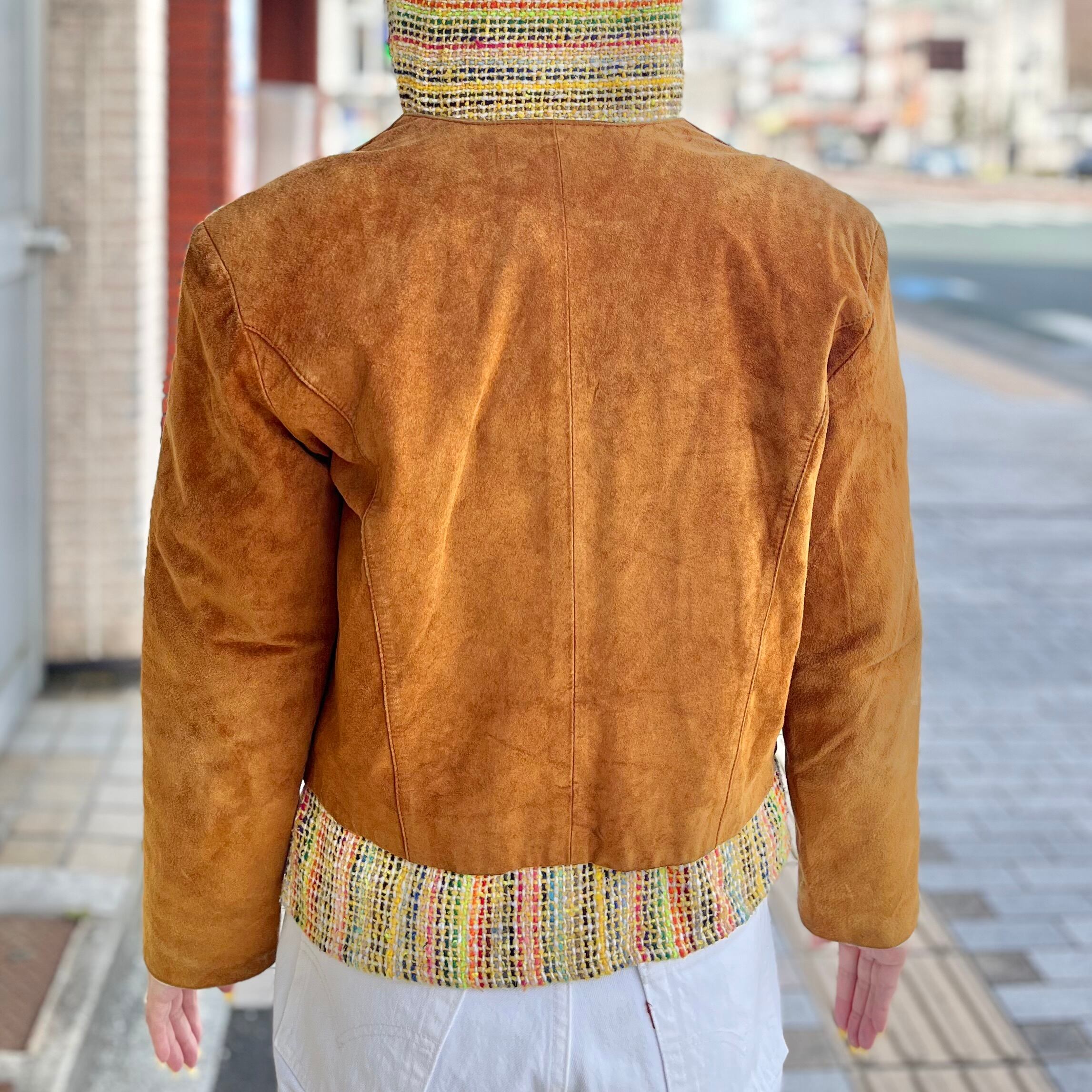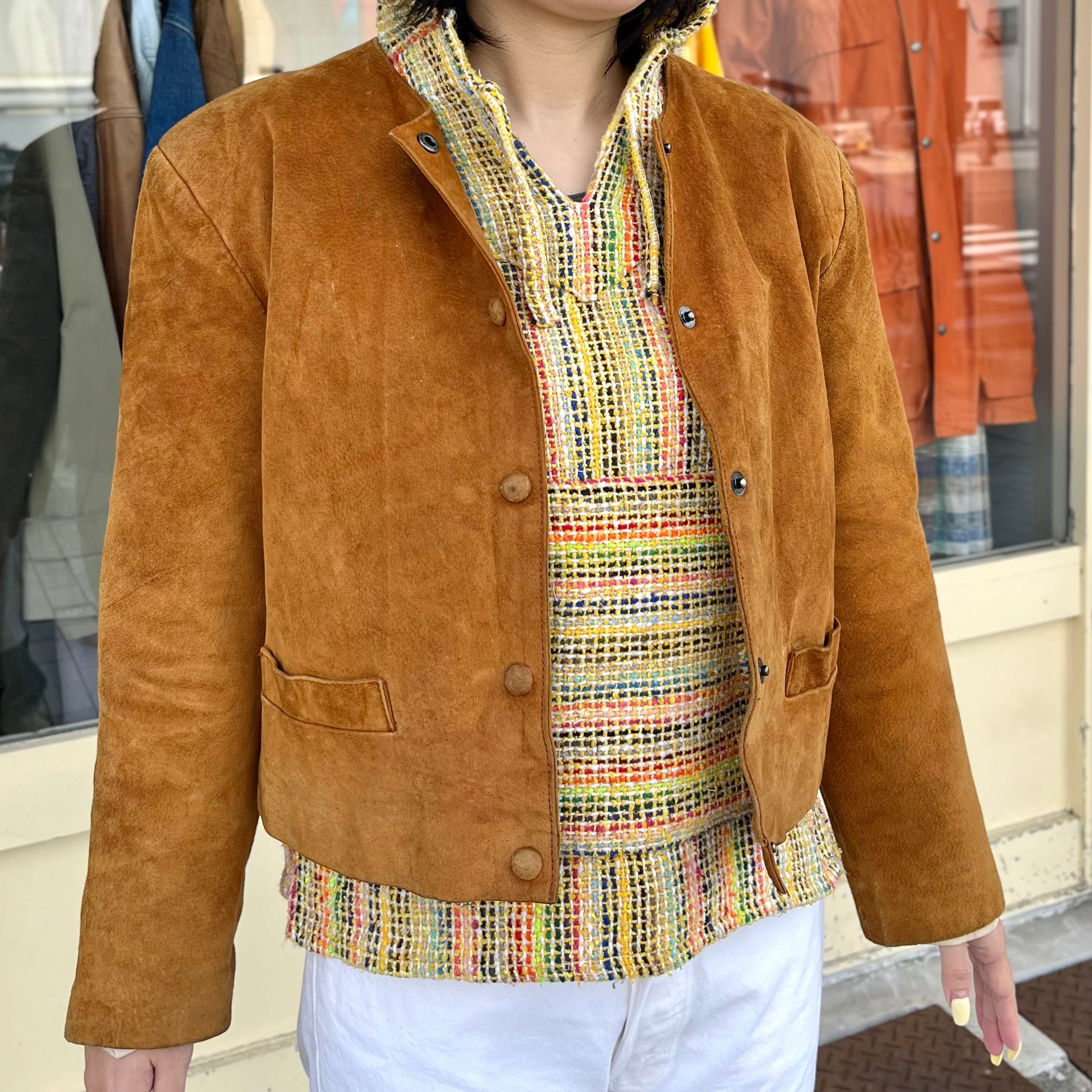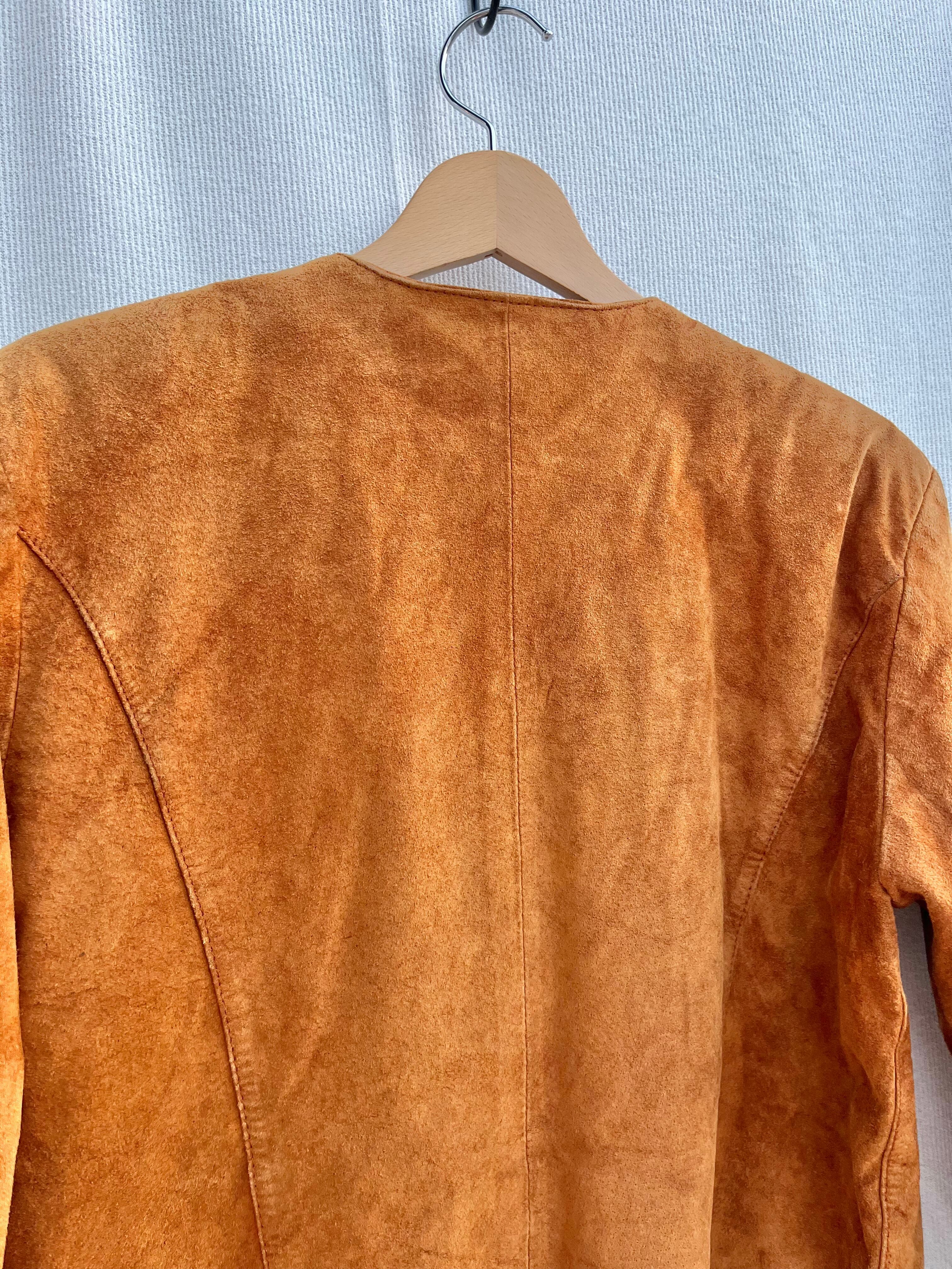 コンパクトなサイズ感にパワーショルダーデザインが特徴的です。着丈が短めの為、バランスが取りやすい一枚です⭐︎ノーカラーなので、シャツを合わせたり、リボンブラウス、スカーフを垂らしてもかっこいいと思います。ロングワンピースやタイトなアイテム等でも綺麗にまとまりますよ。(着用身長 158cm)