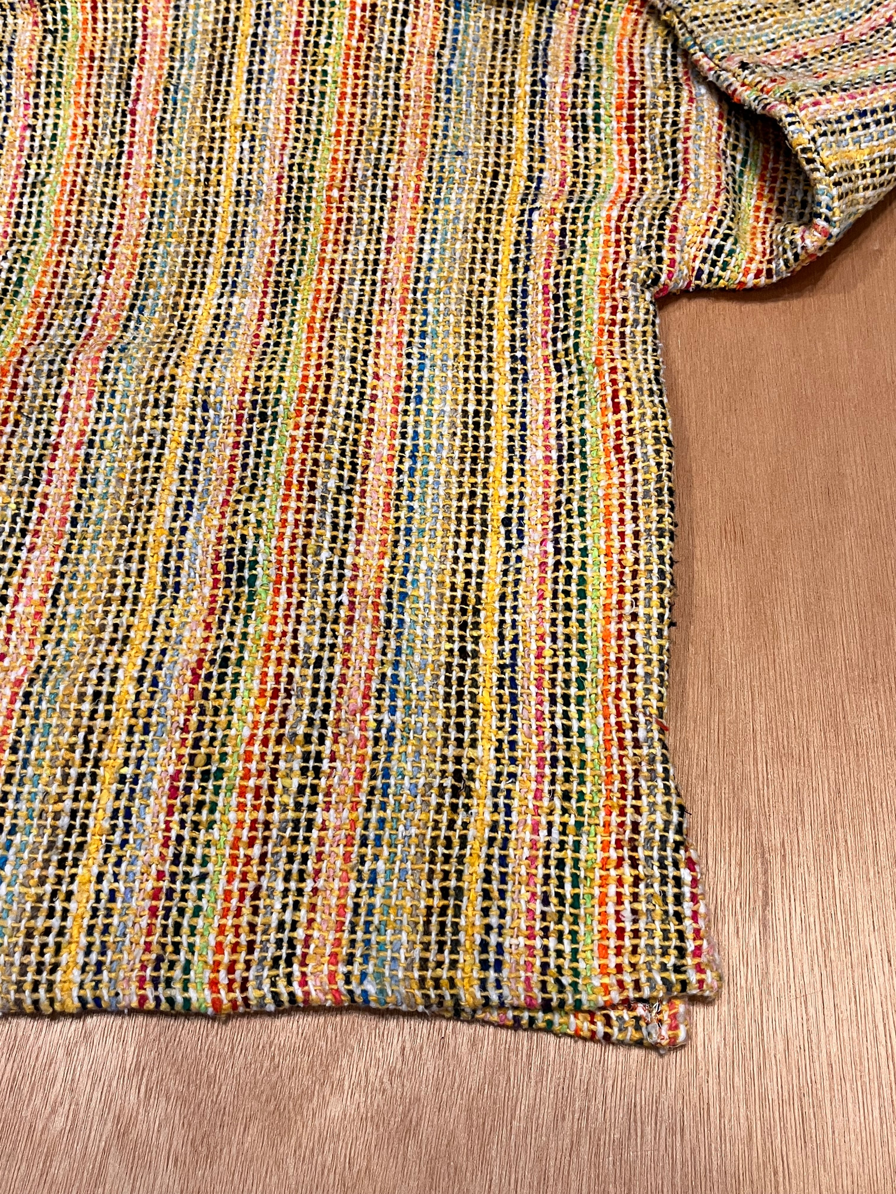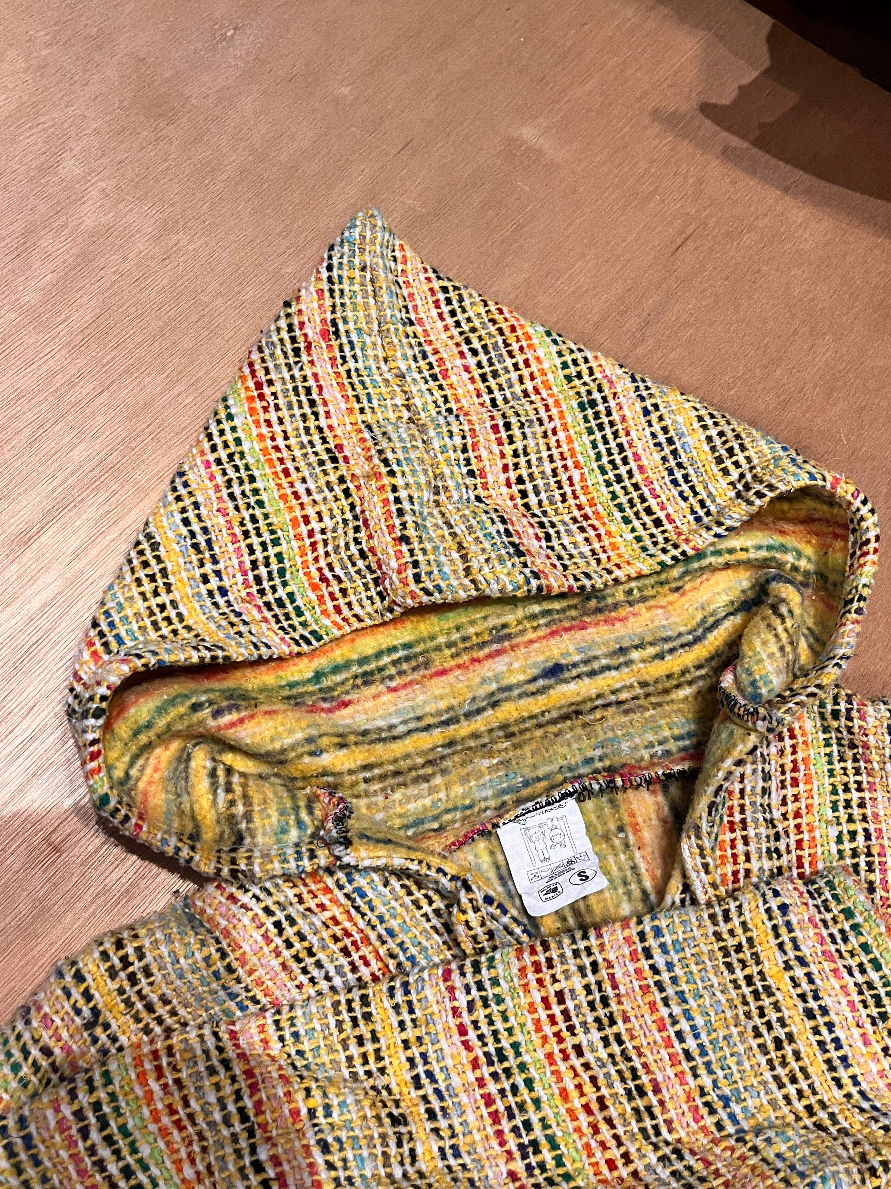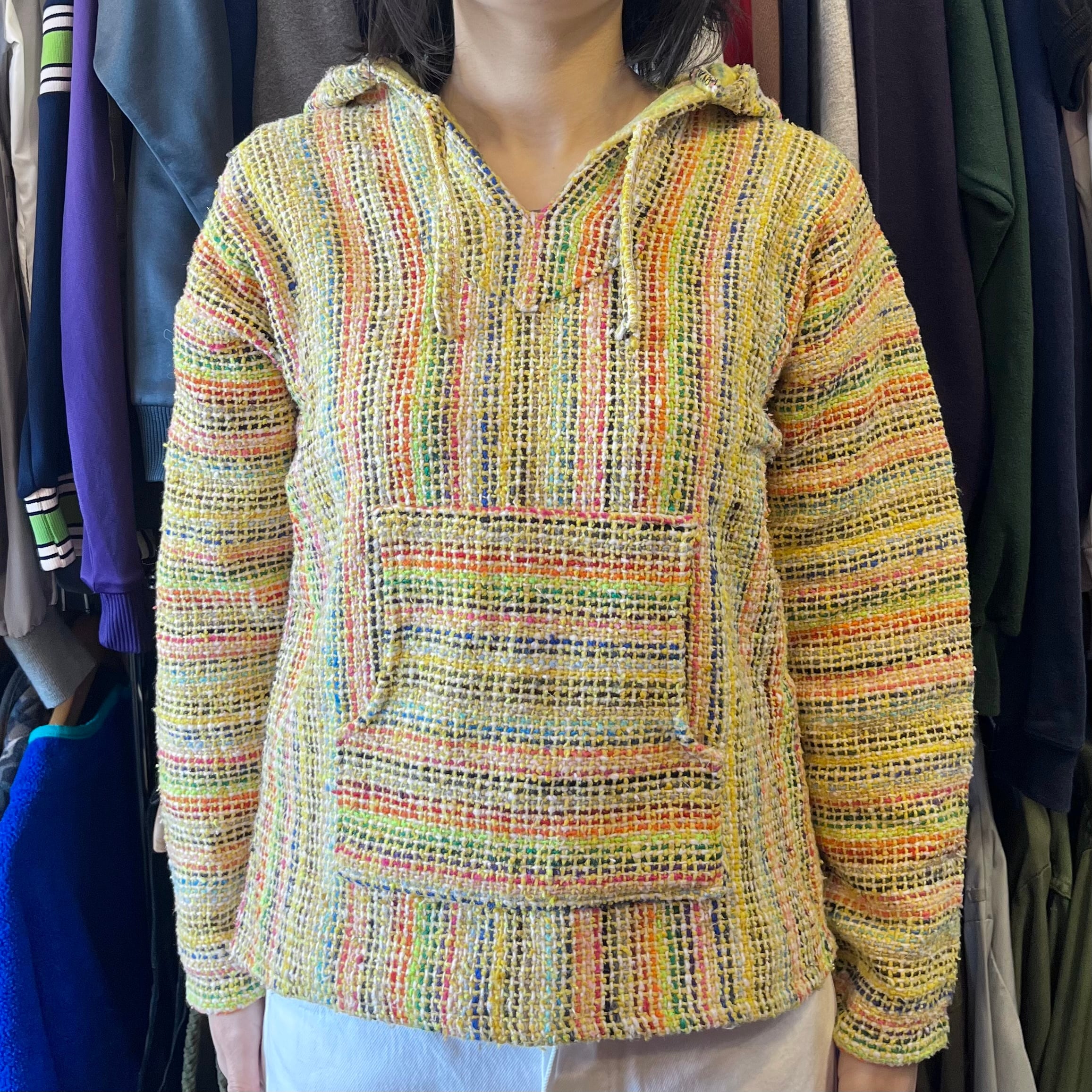 コンパクトさが可愛いメキシカンパーカーです!黄色にカラフルなストライプでポップな印象です。柄スカート、ワンピースとの相性も良いですし、裾からロンTやシャツ、レースなどをレイヤードで見せても素敵ですね。(身長 158cm)