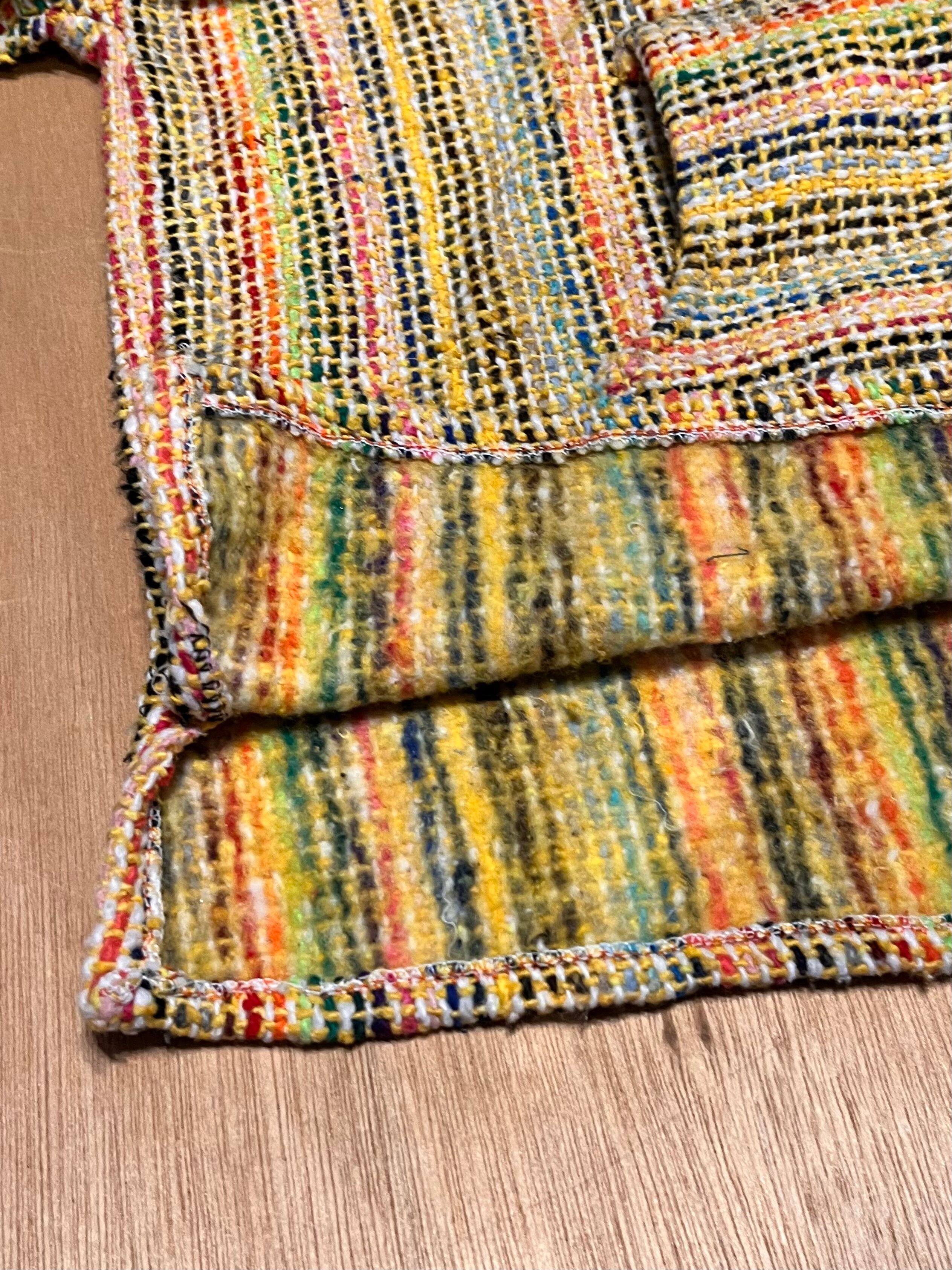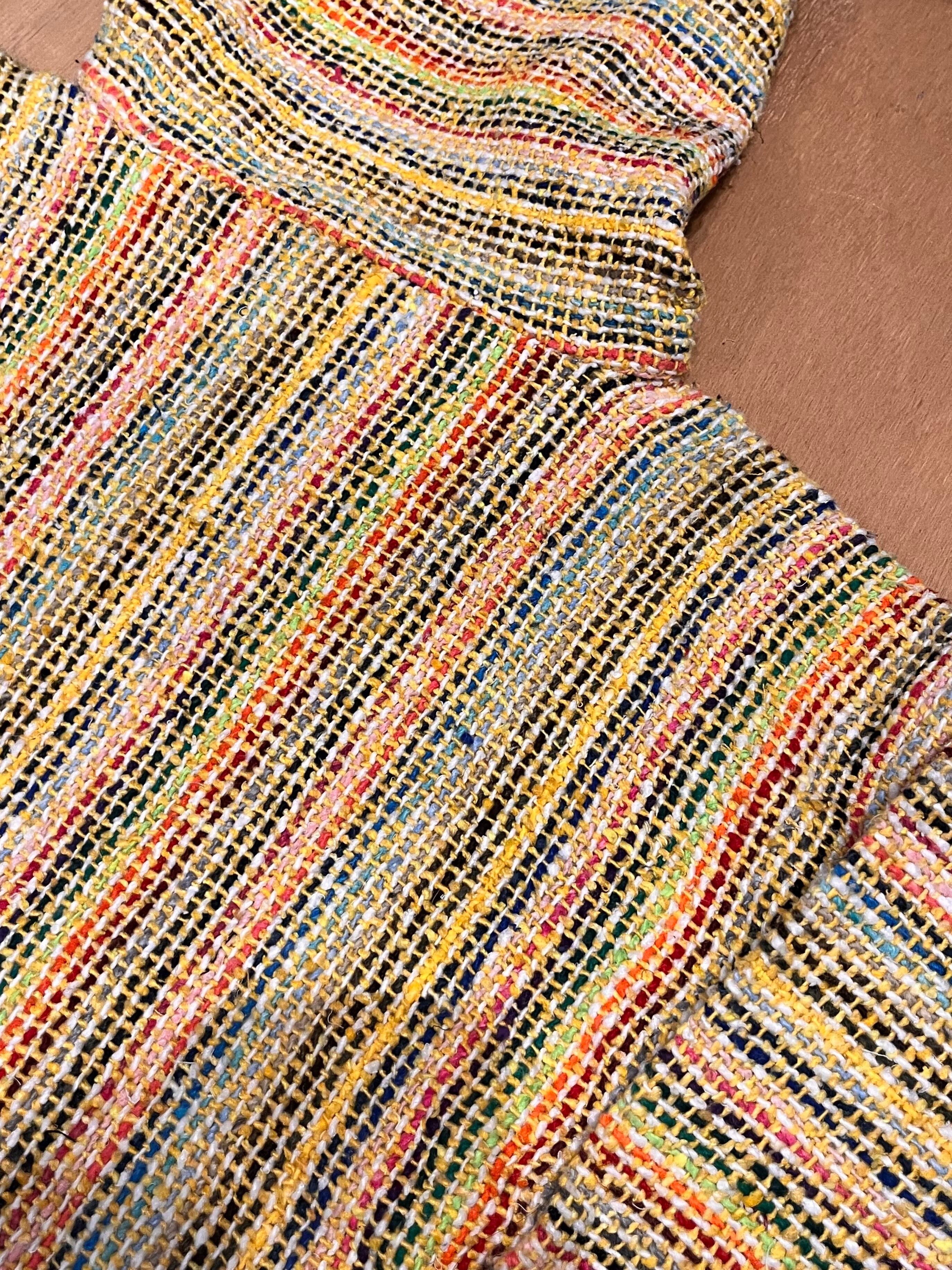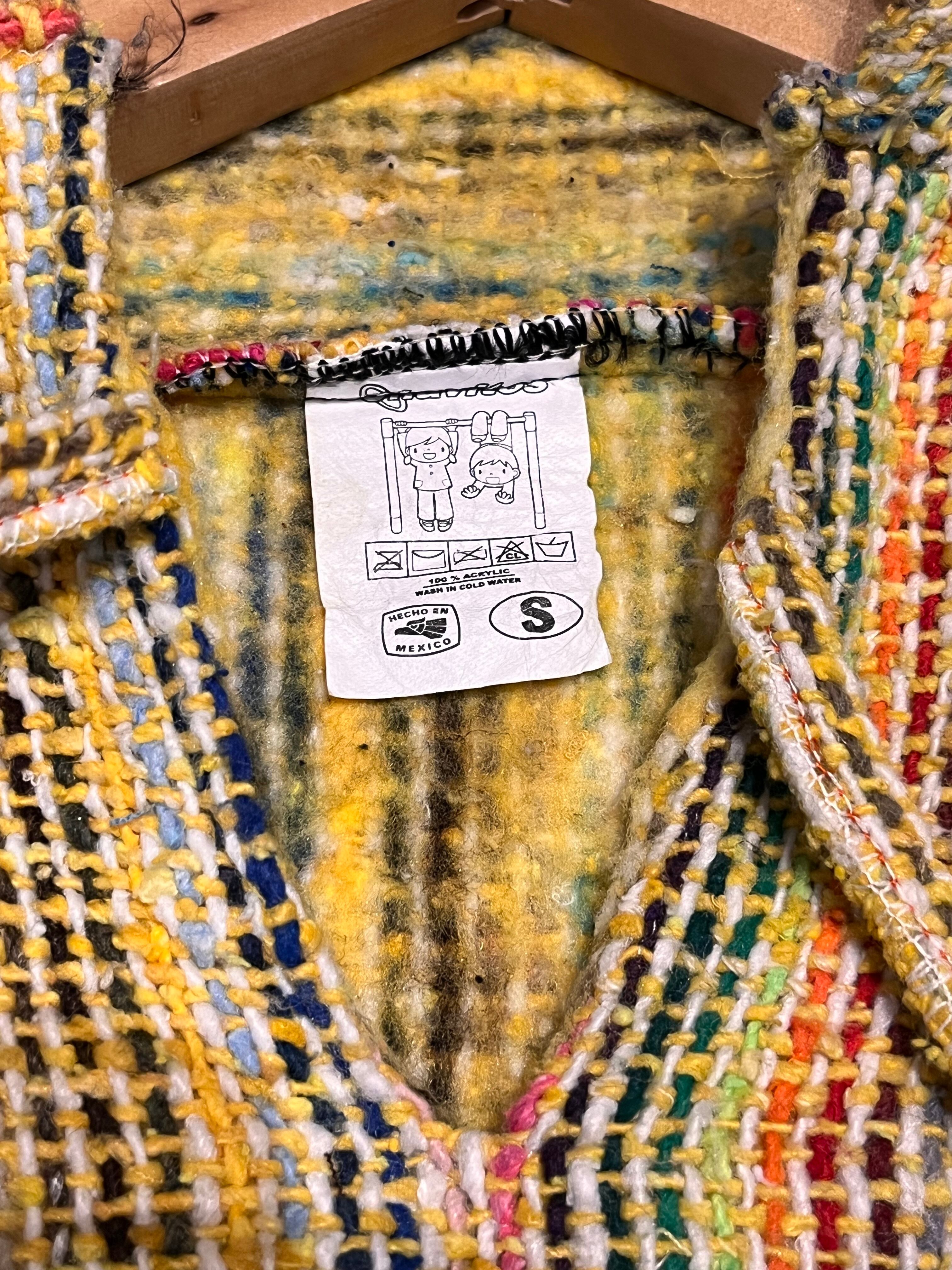 コンパクトさが可愛いメキシカンパーカーです!黄色にカラフルなストライプでポップな印象です。柄スカート、ワンピースとの相性も良いですし、裾からロンTやシャツ、レースなどをレイヤードで見せても素敵ですね。(身長 158cm)