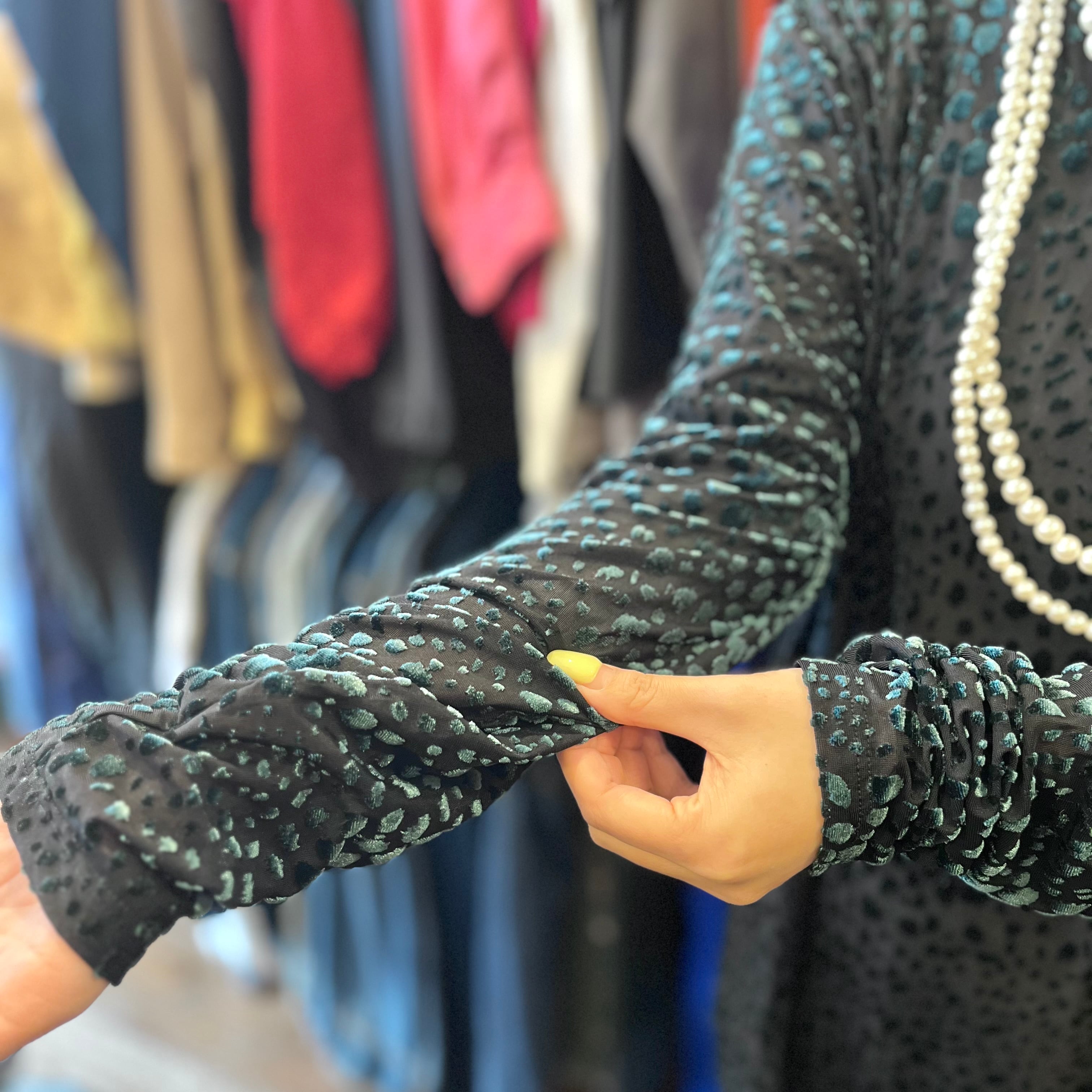 ダークグリーンのダルメシアン柄がかわいいシアートップスです。