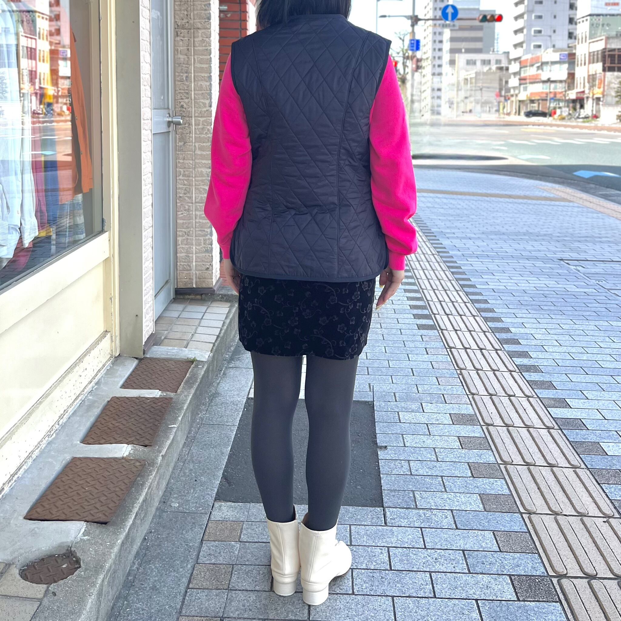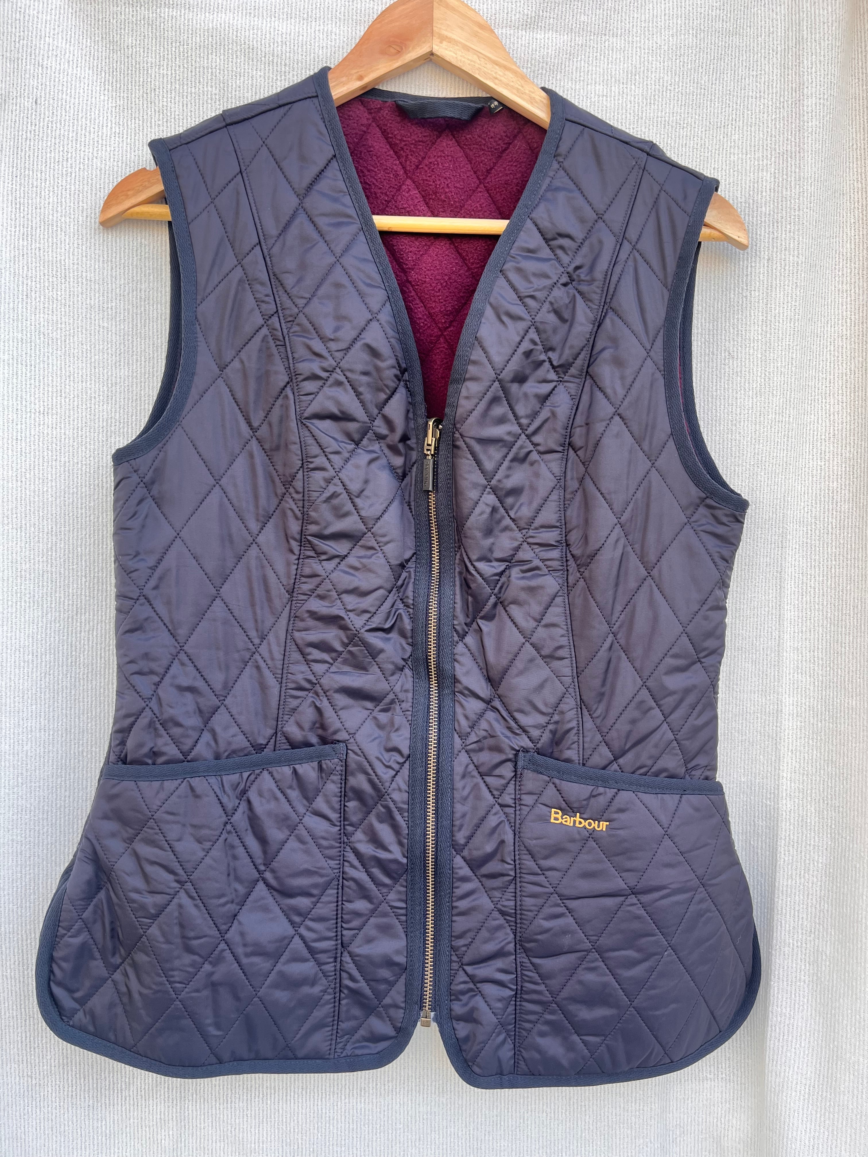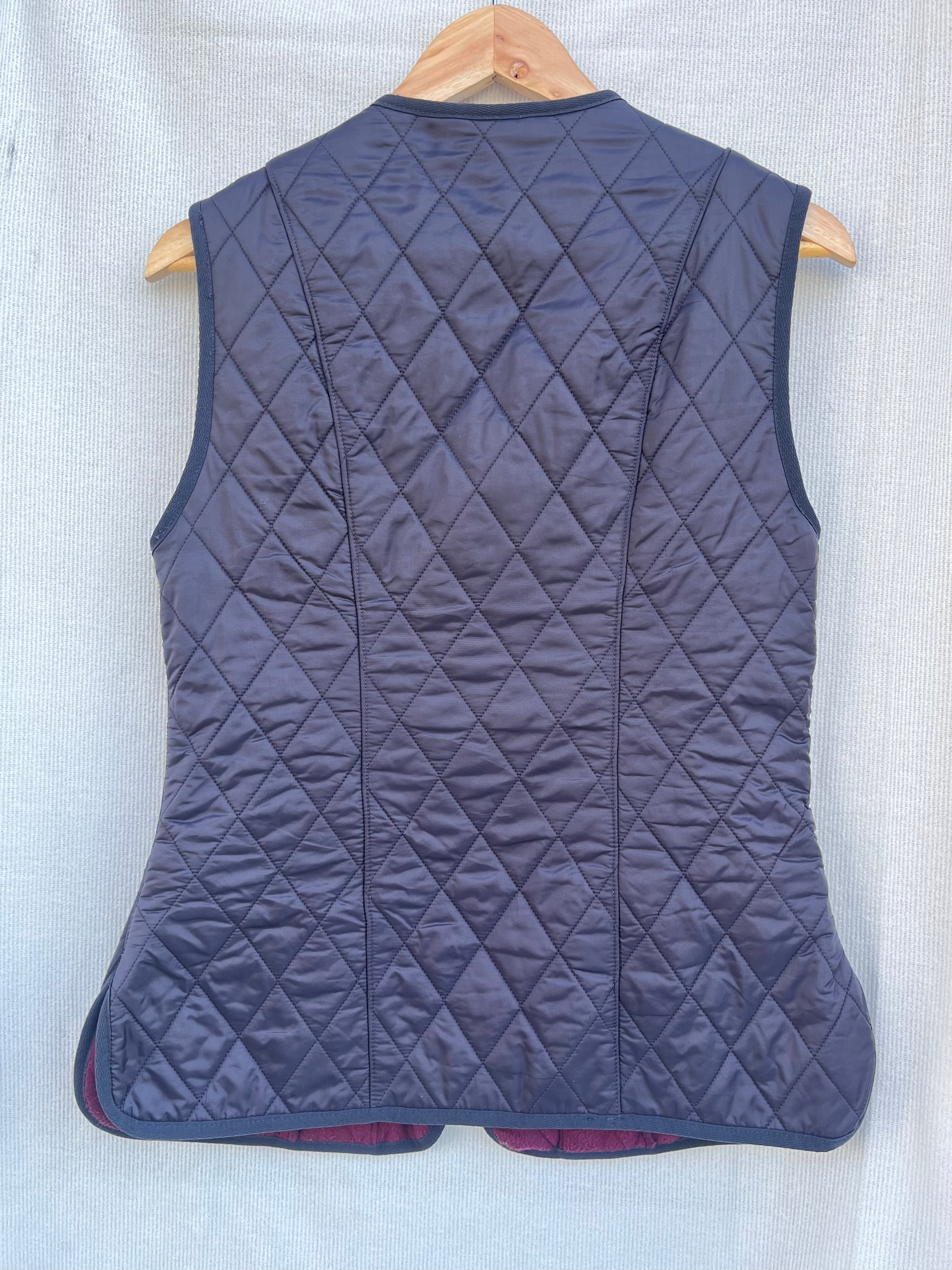 バブアーベストです。裏地はフリース素材になります。ウエストのシェイプ感やラインが上品な印象になり、光沢感もかっこいいです。メンズライクなアイテムにプラスしたり、ゆるっとロングスカートにベストを合わせて、上半身はスッキリなバランスを楽しむのも良さそうです⭐︎(身長 158cm)