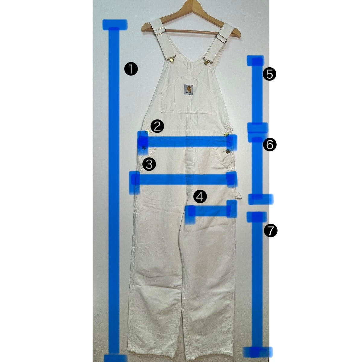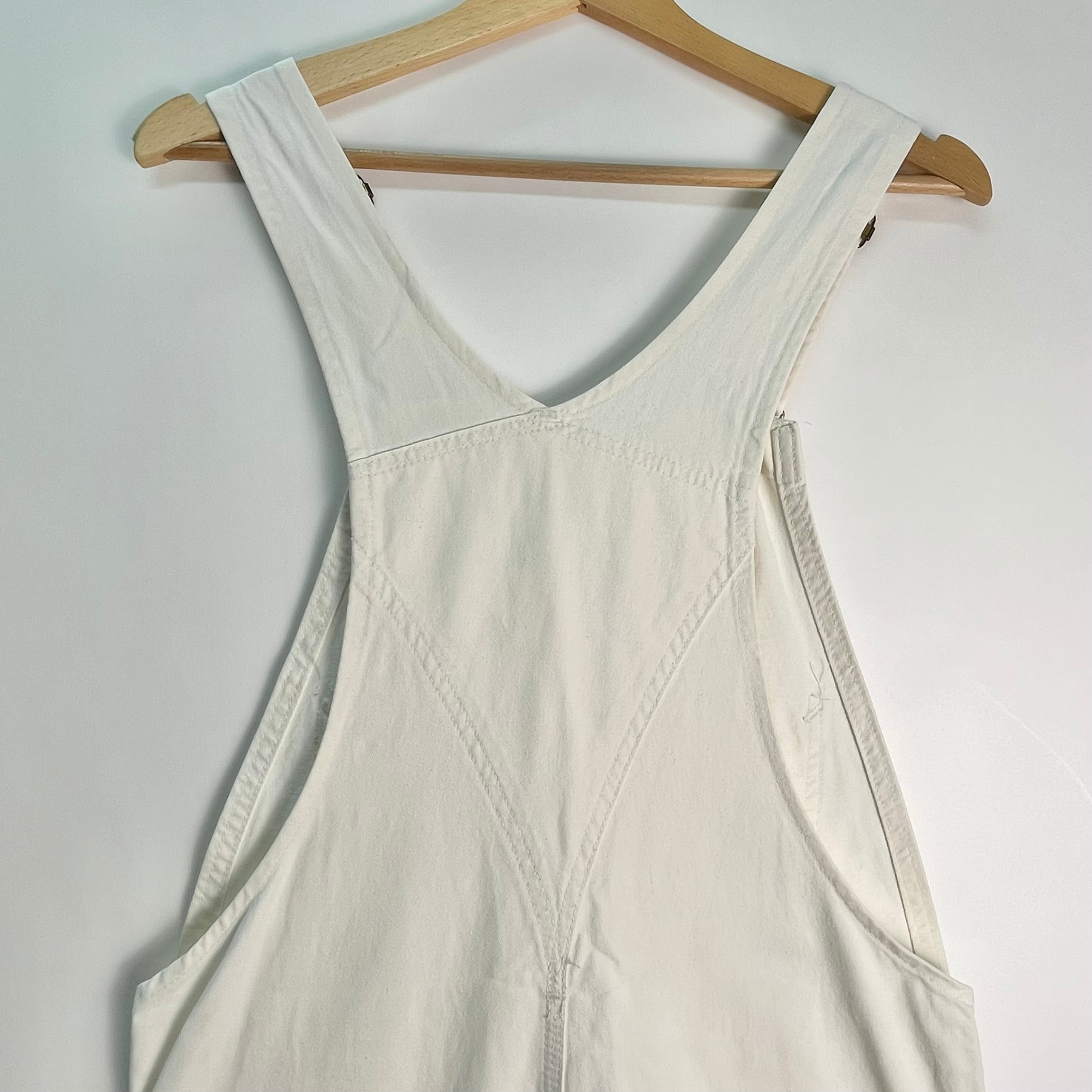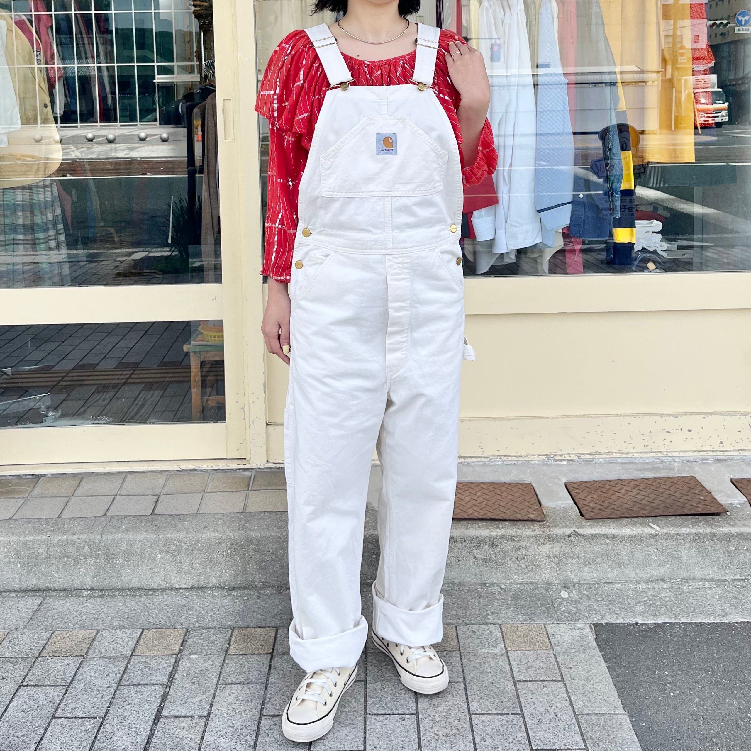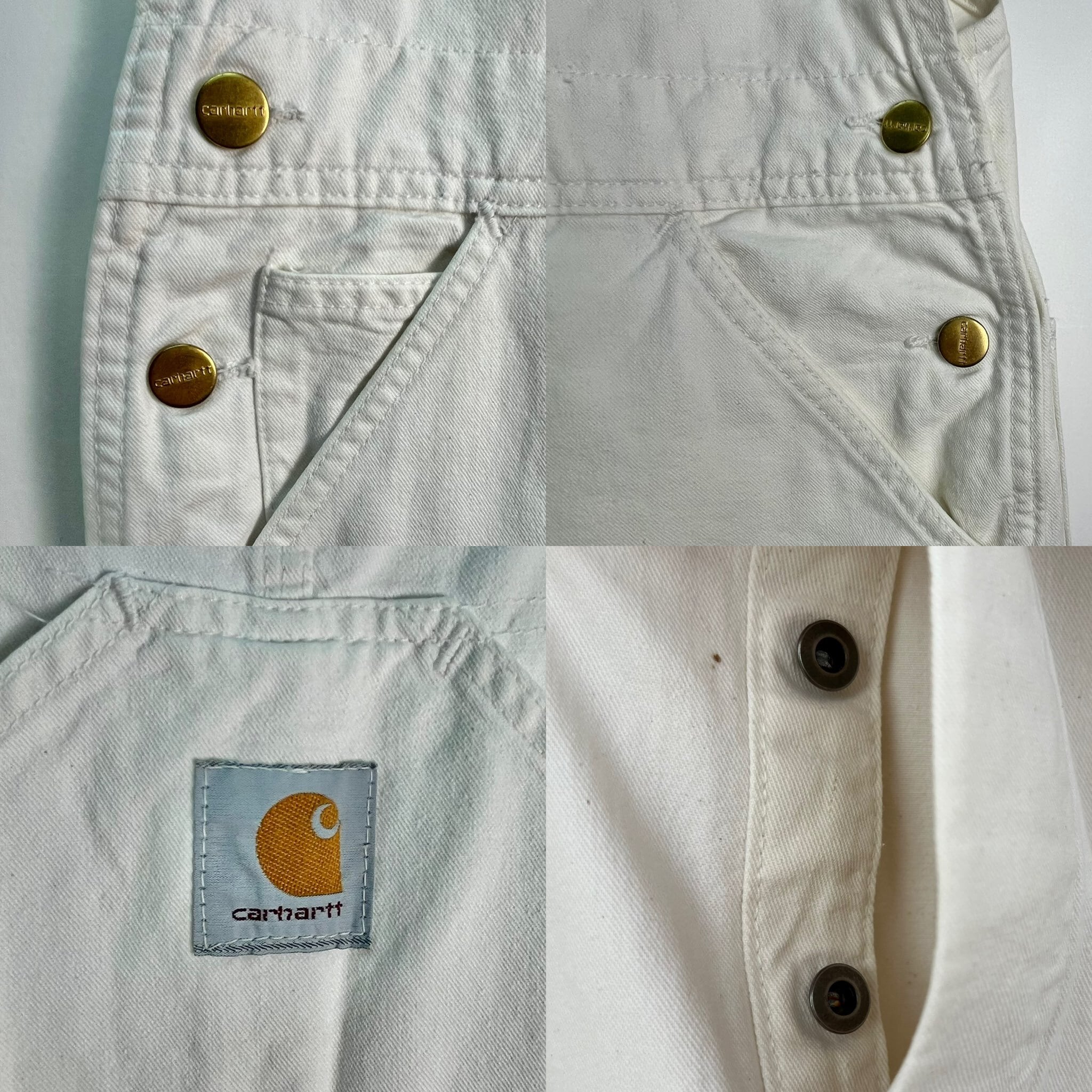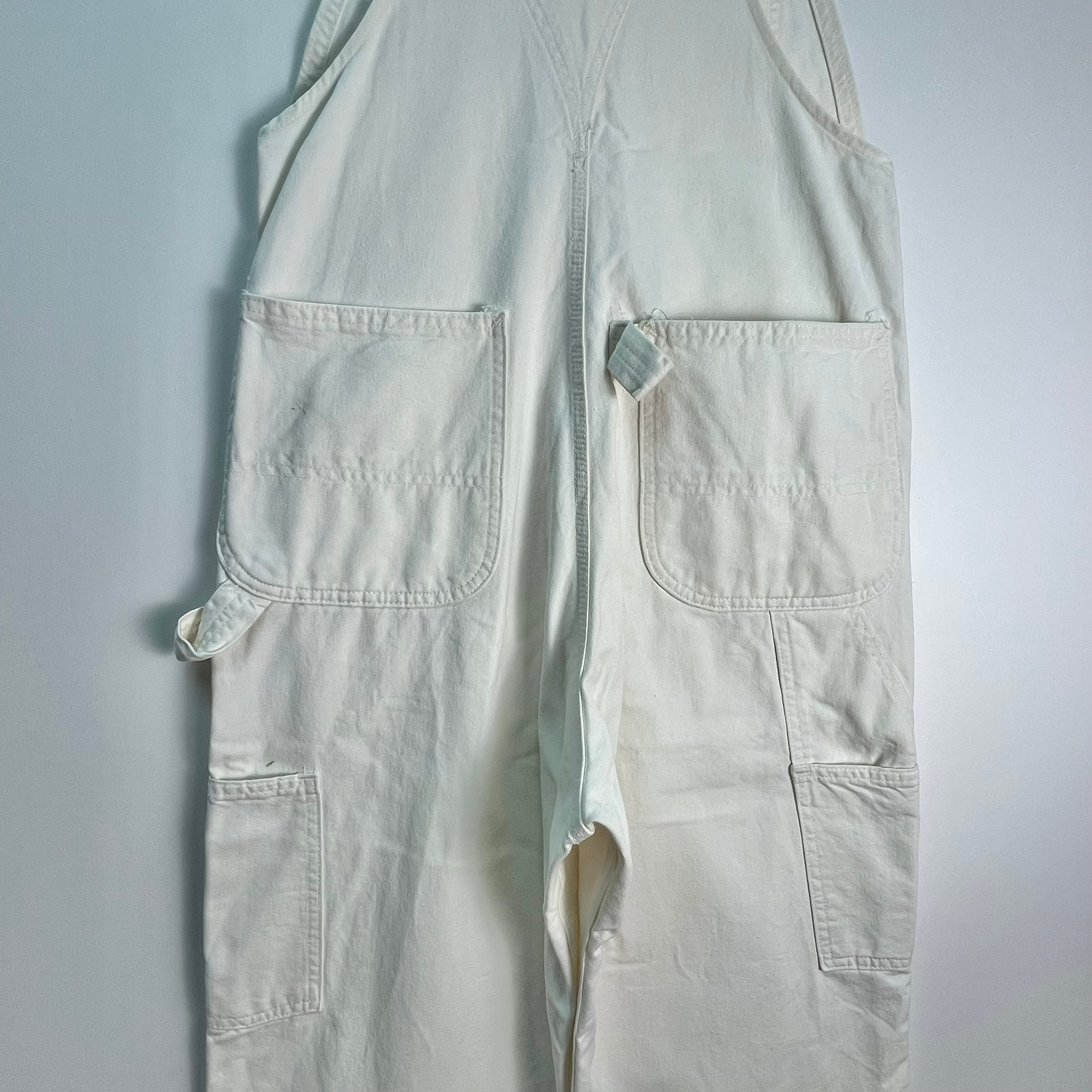 カーハートのダック地より柔らかいCOTTON地で動きやすいです。初夏や秋口でもさらっと履いていただけて爽やかになりますよ。ホワイト色のオーバーオールは古着でも大人っぽく綺麗めスタイルにも取り入れやすいのがポイントです⭐︎