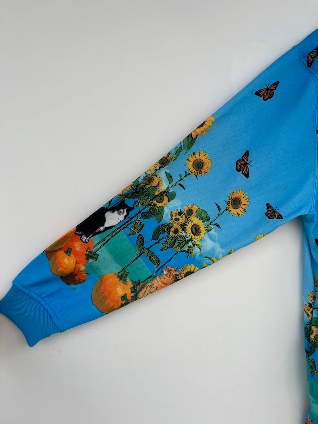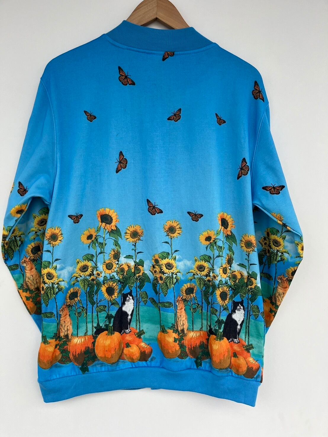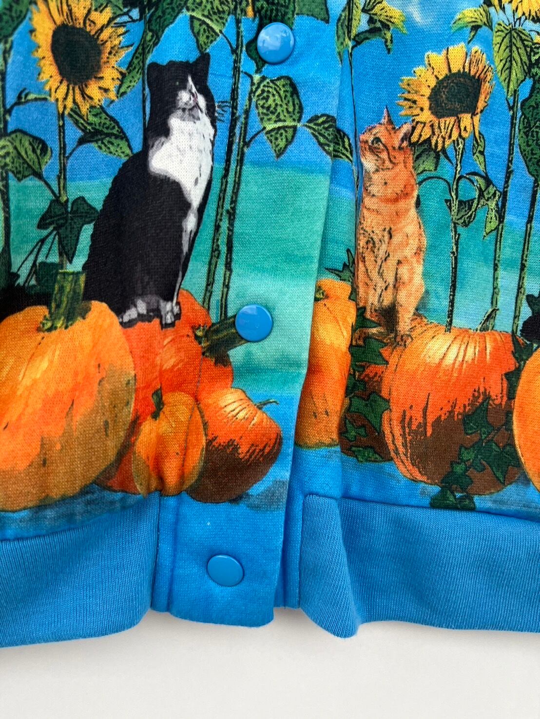 かぼちゃに猫、ひまわりと融合具合が面白い、HAPPY感のあるネコカーディガンです。