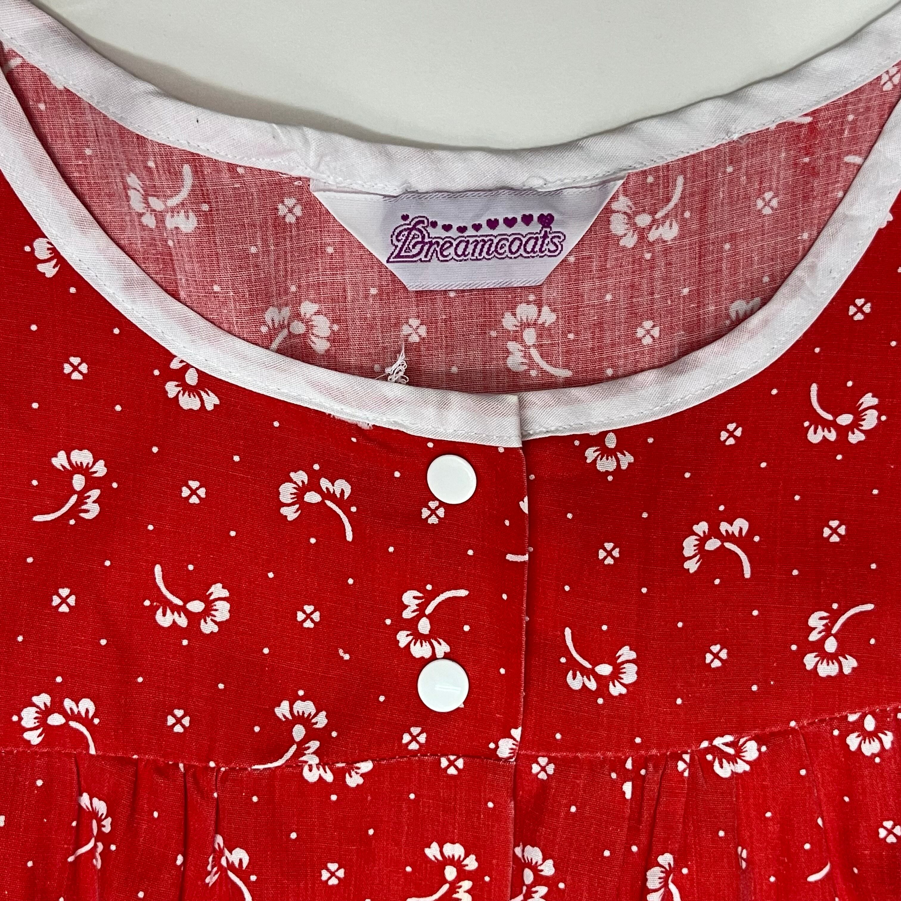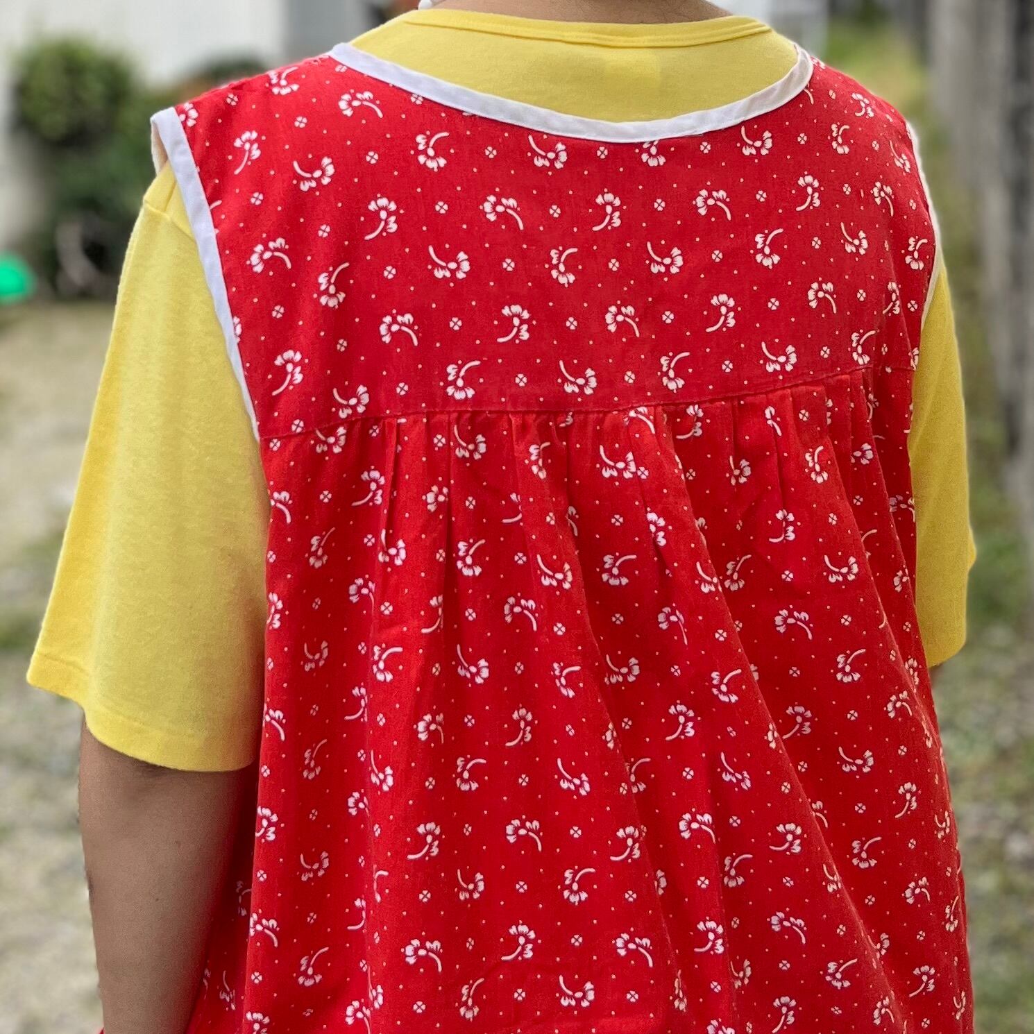 赤色の生地に白のお花とドット模様のノースリーブワンピースです。