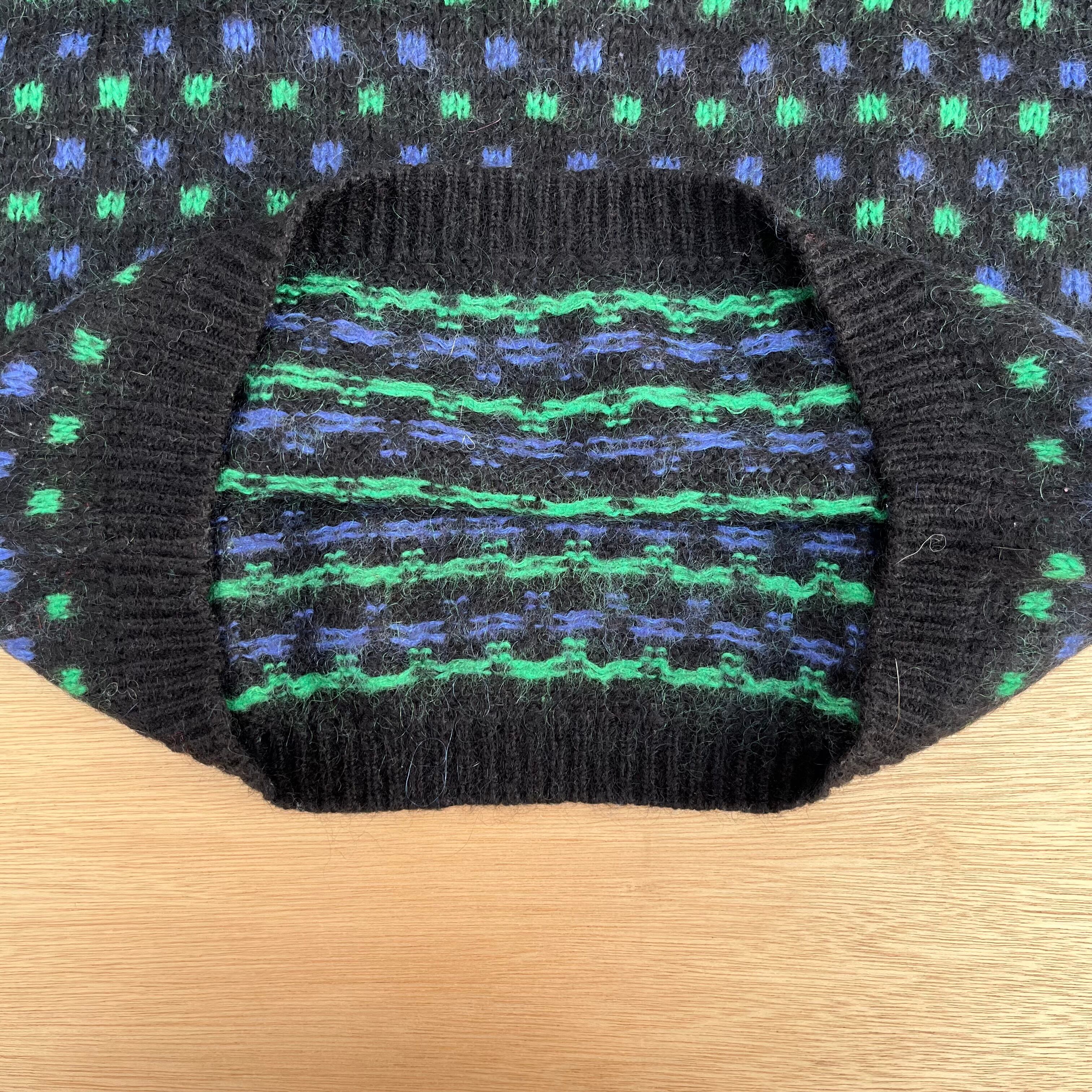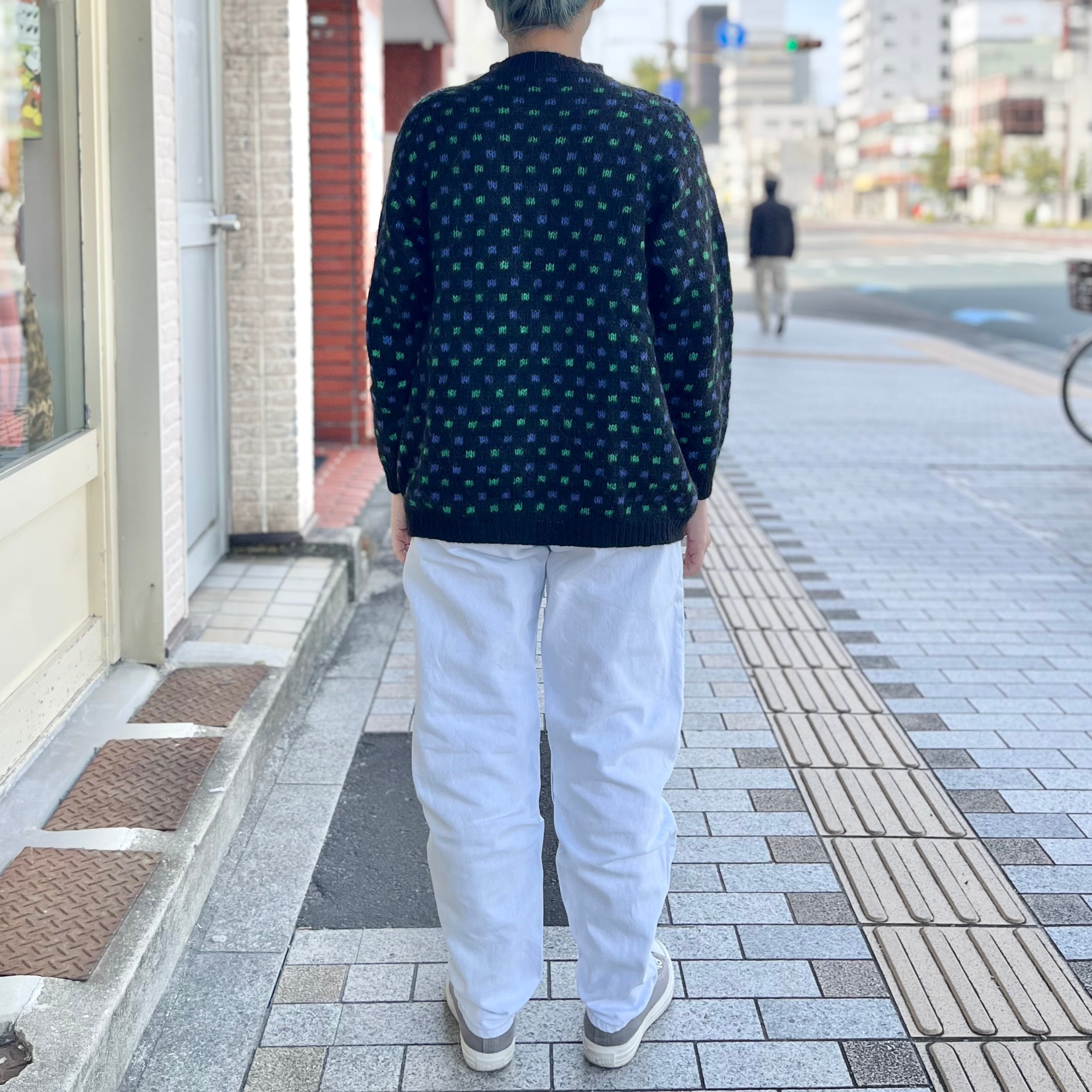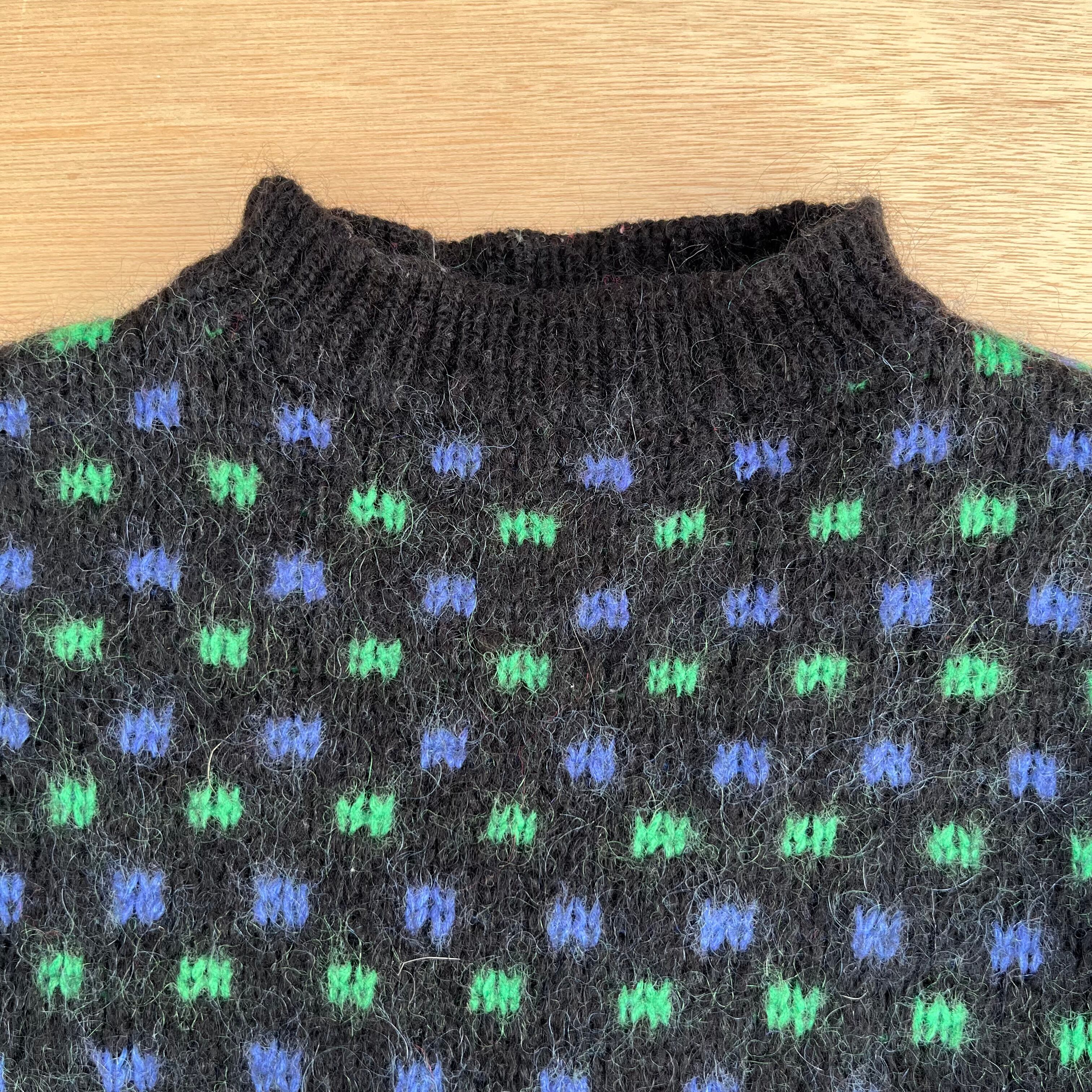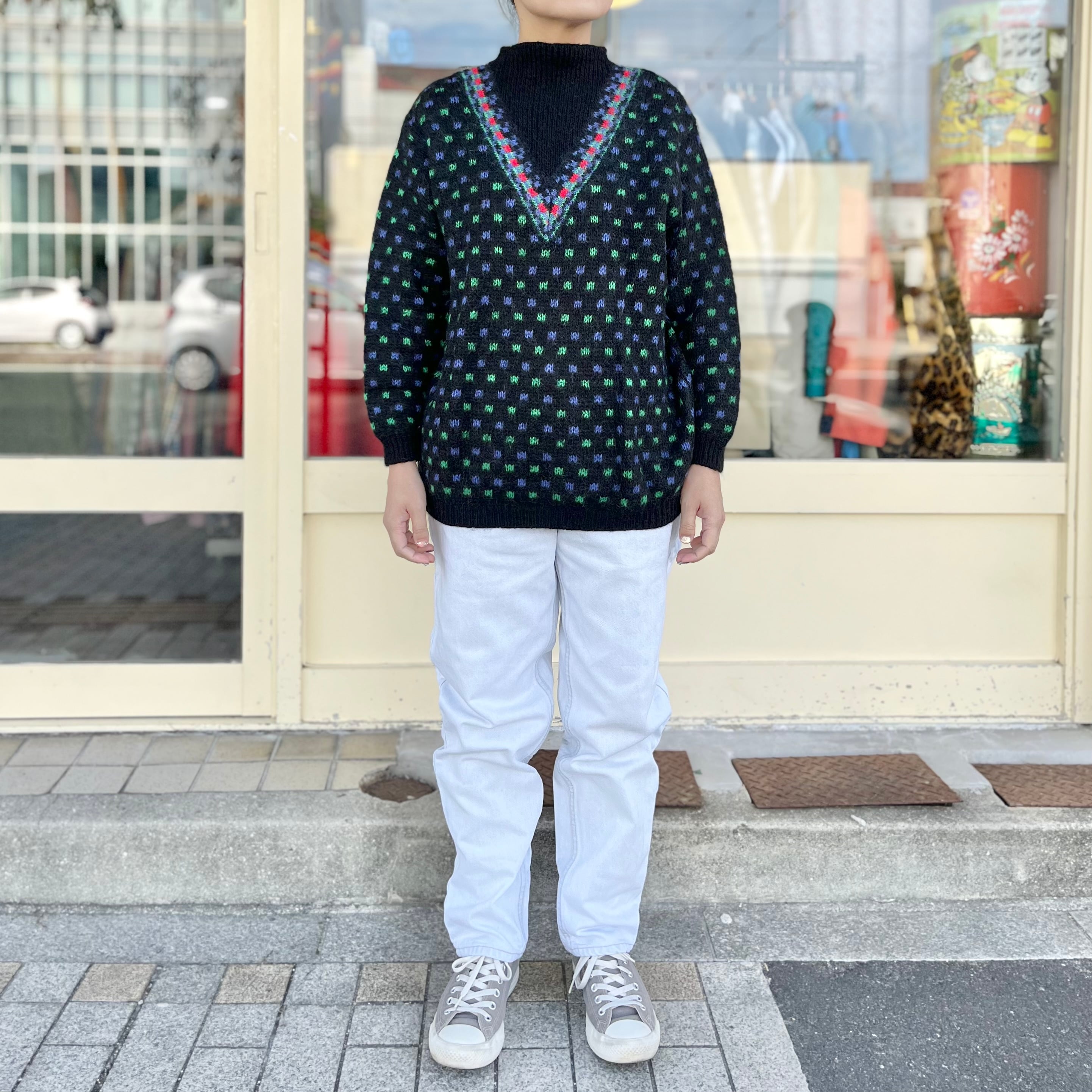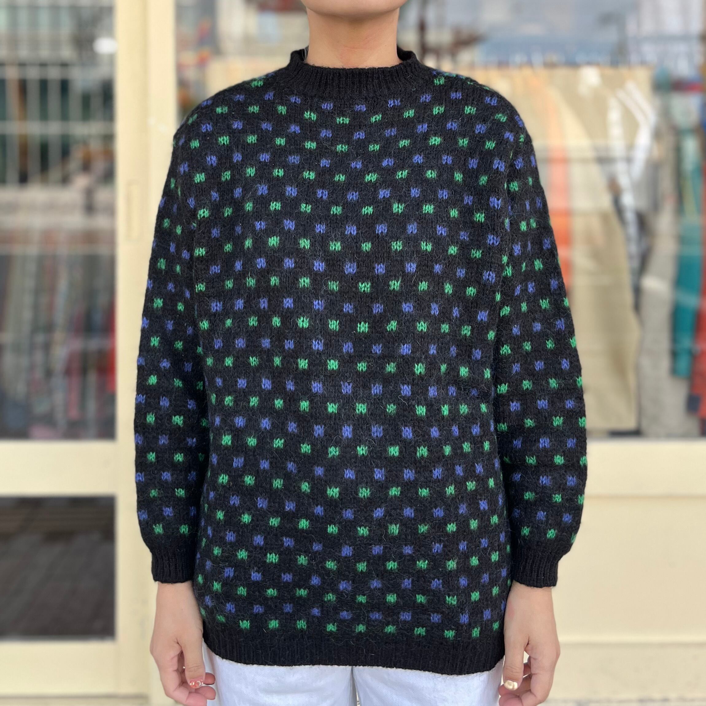 ハイネックのデザインがかわいいニットセーターです。ドットのような模様がレトロで可愛いですね。