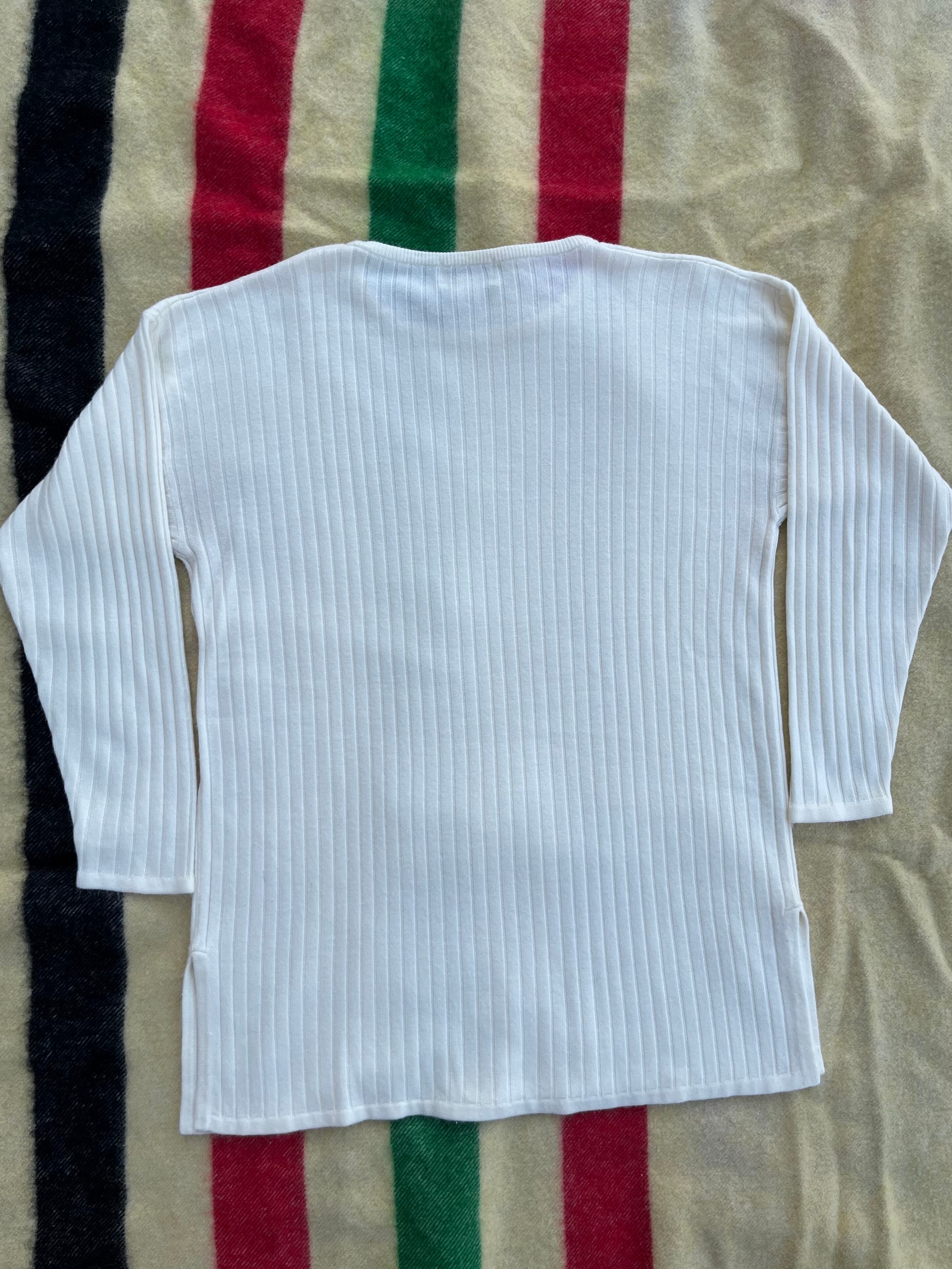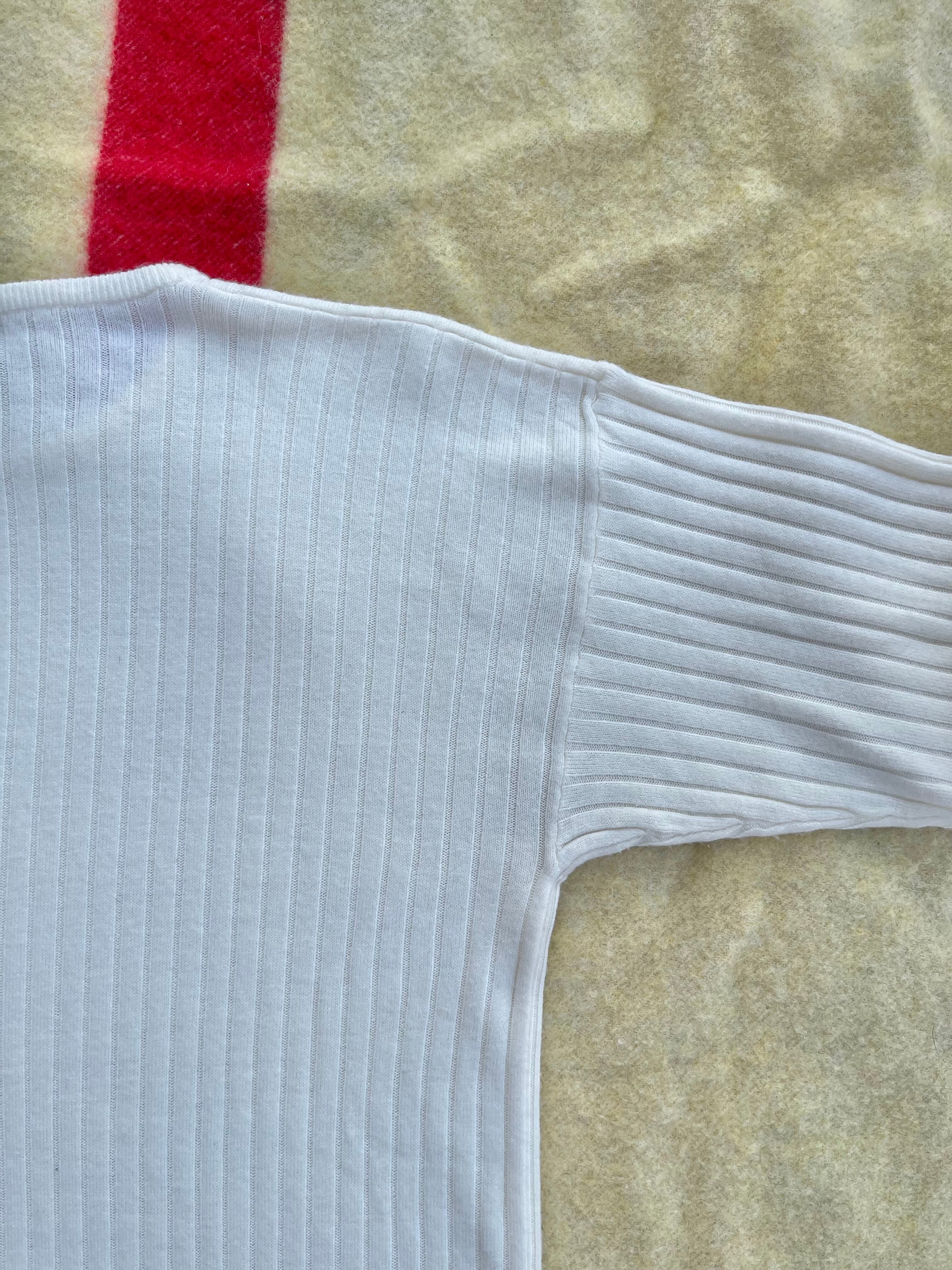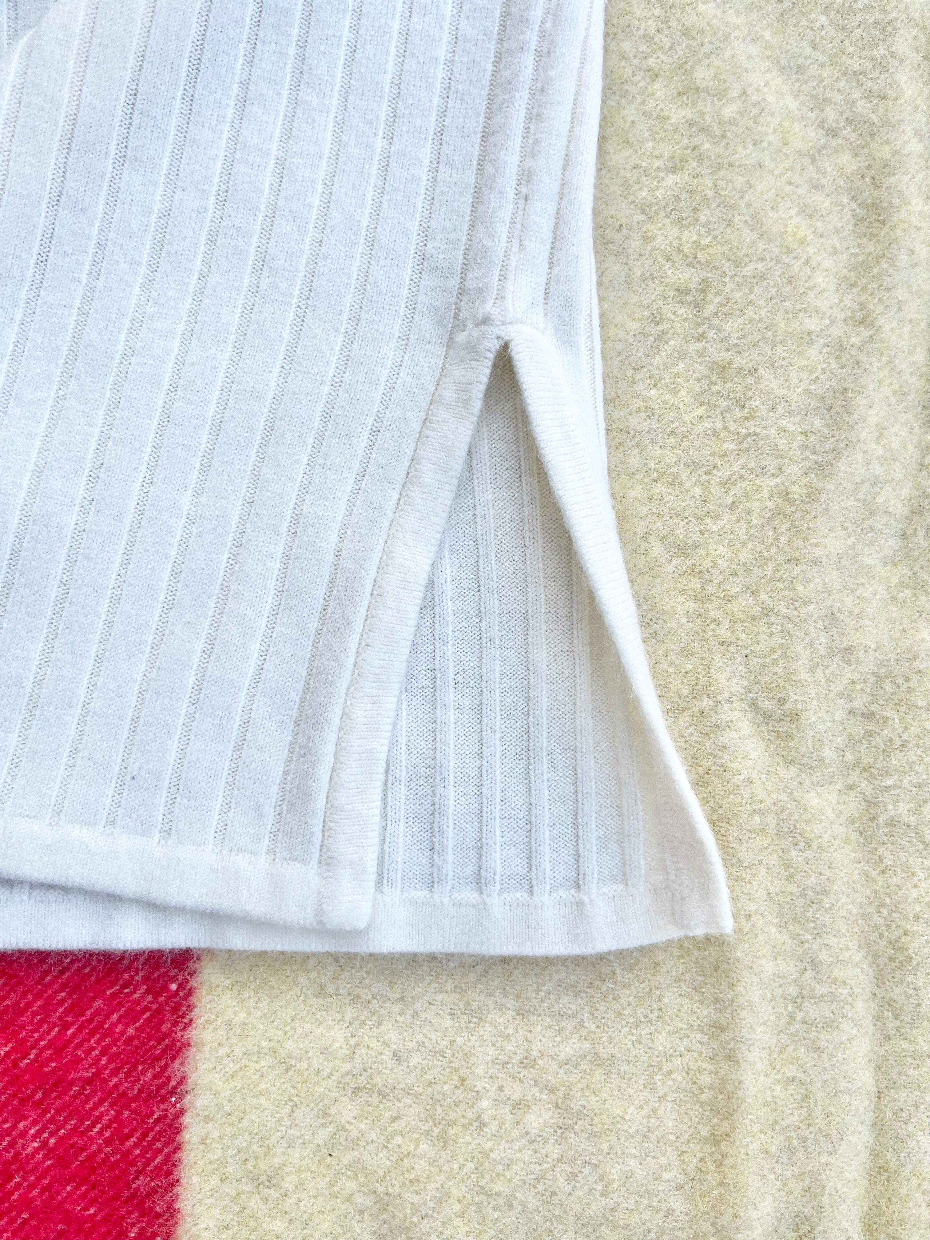 ラインが綺麗なシンプルニットトップスです。お尻周りまでの長さがあり、薄い生地感でインナー使いやベストと合わせるのも良さそうです!スリット入りでボトムスも選ばず、合わせやすいですよ。